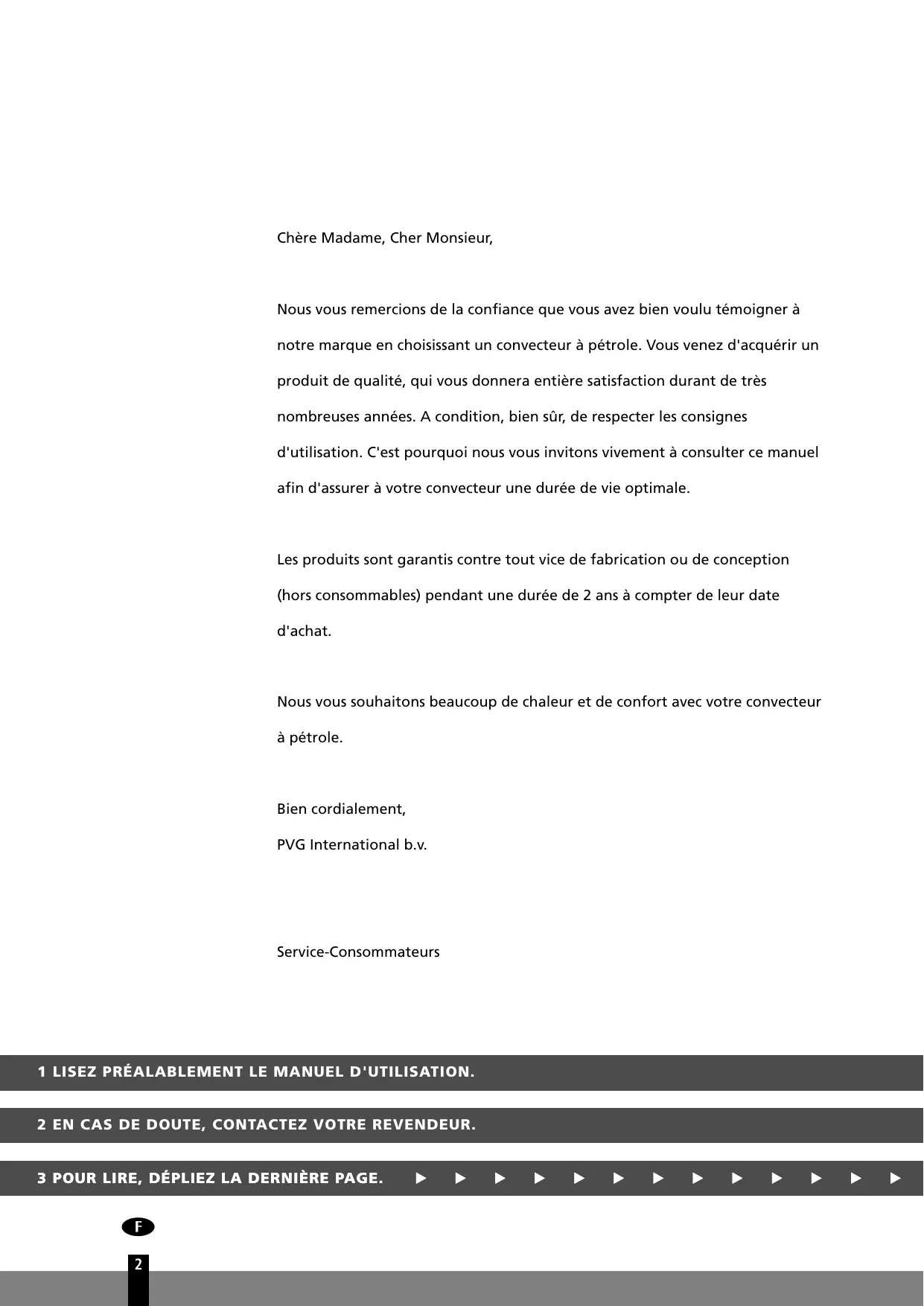 Chère Madame, Cher Monsieur, Nous vous remercions de la confiance que vous avez bien voulu témoigner à notre marque en choisissant un convecteur à pétrole. Vous venez d'acquérir un produit de qualité, qui vous donnera entière satisfaction durant de très nombreuses années. A condition, bien sûr, de respecter les consignes d'utilisation. C'est pourquoi nous vous invitons vivement à consulter ce manuel afin d'assurer à votre convecteur une durée de vie optimale. Les produits sont garantis contre tout vice de fabrication ou de conception (hors consommables) pendant une durée de 2 ans à compter de leur date d'achat. Nous vous souhaitons beaucoup de chaleur et de confort avec votre convecteur à pétrole. Bien cordialement, PVG International b.v. Service-Consommateurs 1 LISEZ PRÉALABLEMENT LE MANUEL D'UTILISATION. 2 EN CAS DE DOUTE, CONTACTEZ VOTRE REVENDEUR. 3 POUR LIRE, DÉPLIEZ LA DERNIÈRE PAGE.