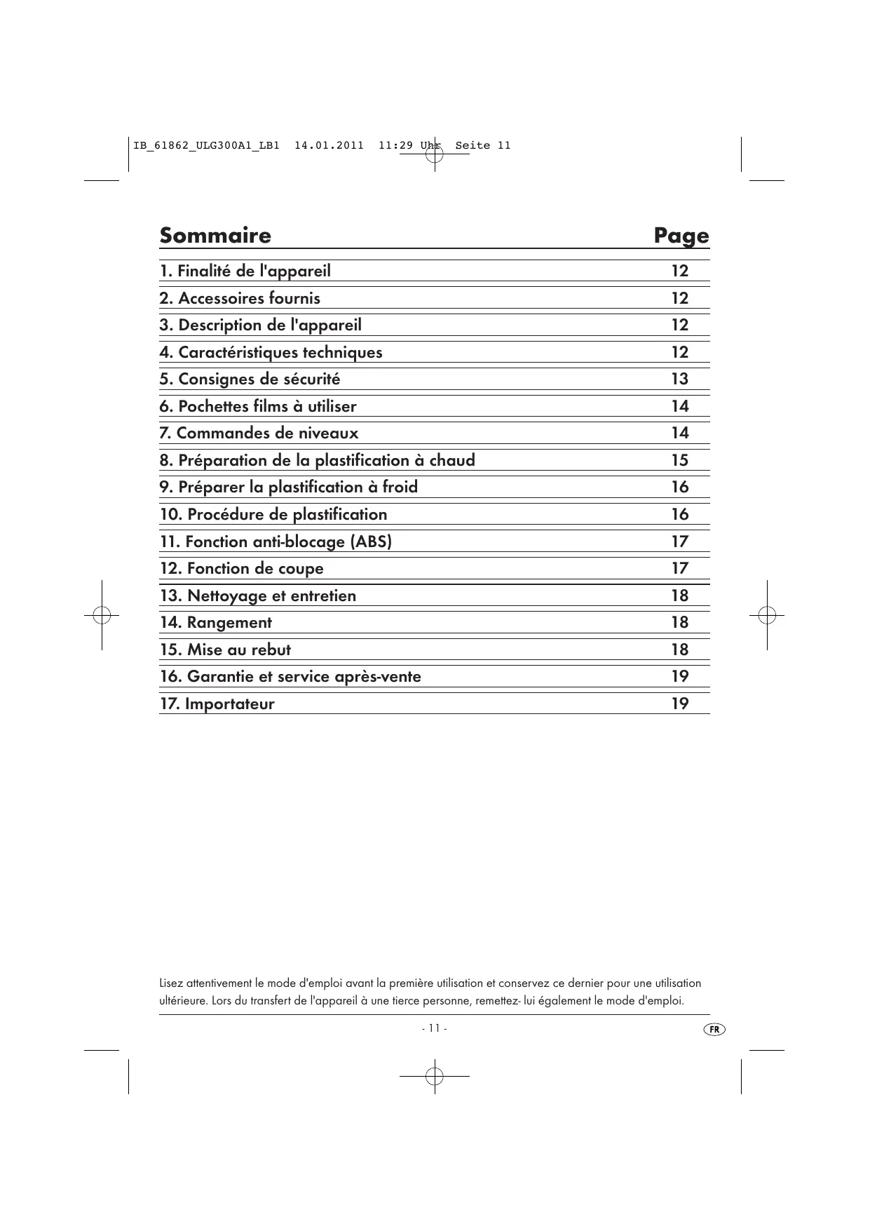 Lisez attentivement le mode d'emploi avant la première utilisation et conservez ce dernier pour une utilisation ultérieure. Lors du transfert de l'appareil à une tierce personne, remettez- lui également le mode d'emploi. - 11 -