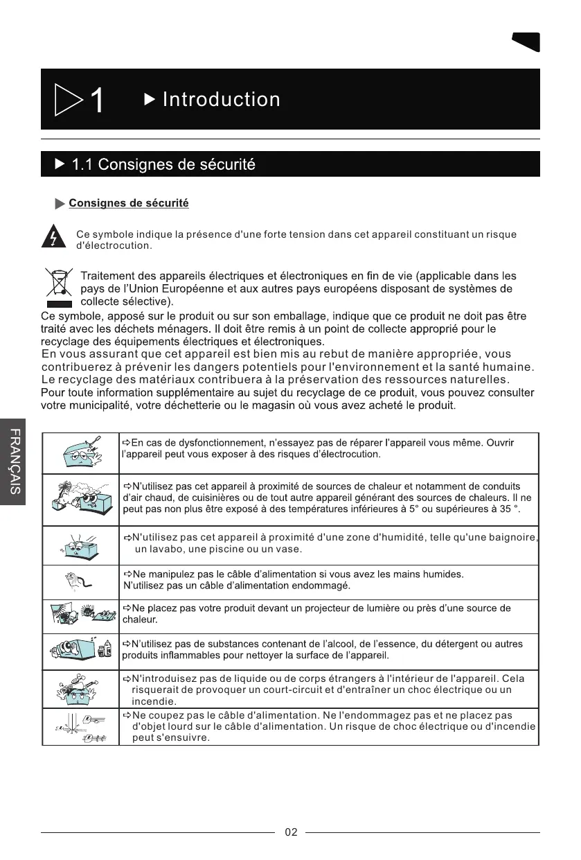 Introduction Ce symbole indique la présence d'une forte tension dans cet appareil constituant un risque d'électrocution. En vous assurant que cet appareil est bien mis au rebut de manière appropriée, vous contribuerez à prévenir les dangers potentiels pour l'environnement et la santé humaine. Le recyclage des matériaux contribuera à la préservation des ressources naturelles. N'utilisez pas cet appareil à proximité d'une zone d'humidité, telle qu'une baignoire, un lavabo, une piscine ou un vase. N'introduisez pas de liquide ou de corps étrangers à l'intérieur de l'appareil. Cela risquerait de provoquer un court-circuit et d'entraîner un choc électrique ou un incendie. Ne coupez pas le câble d'alimentation. Ne l'endommagez pas et ne placez pas d'objet lourd sur le câble d'alimentation. Un risque de choc électrique ou d'incendie peut s'ensuivre.