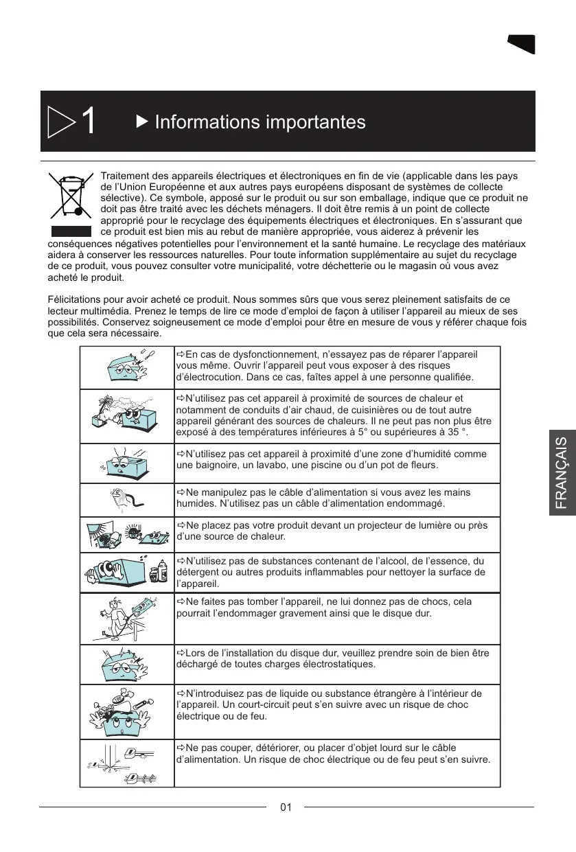 En cas de dysfonctionnement, n’essayez pas de réparer l’appareil vous même. Ouvrir l’appareil peut vous exposer à des risques d’électrocution. Dans ce cas, faîtes appel à une personne qualifiée. a N’utilisez pas cet appareil à proximité de sources de chaleur et notamment de conduits d’air chaud, de cuisinières ou de tout autre appareil générant des sources de chaleurs. Il ne peut pas non plus être exposé à des températures inférieures à 5° ou supérieures à 35 °. N’utilisez pas cet appareil à proximité d’une zone d’humidité comme a une baignoire, un lavabo, une piscine ou d’un pot de fleurs. a Ne manipulez pas le câble d’alimentation si vous avez les mains humides. N’utilisez pas un câble d’alimentation endommagé. a Ne placez pas votre produit devant un projecteur de lumière ou près d’une source de chaleur. a N’utilisez pas de substances contenant de l’alcool, de l’essence, du détergent ou autres produits inflammables pour nettoyer la surface de l’appareil. a Ne faites pas tomber l’appareil, ne lui donnez pas de chocs, cela pourrait l’endommager gravement ainsi que le disque dur.