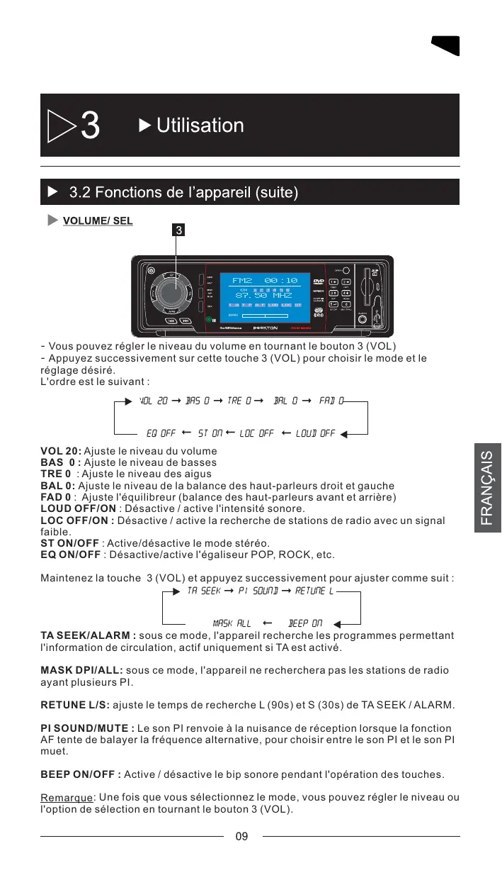 T A T P A F LOD LOC ST BAS - Vous pouvez régler le niveau du volume en tournant le bouton 3 (VOL) - Appuyez successivement sur cette touche 3 (VOL) pour choisir le mode et le réglage désiré. L'ordre est le suivant : VOL 20 EQ OFF BAS 0 ST ON TRE 0 BAL 0 LOC OFF FAD 0 LOUD OFF VOL 20: Ajuste le niveau du volume BAS 0 : Ajuste le niveau de basses TRE 0 : Ajuste le niveau des aigus BAL 0: Ajuste le niveau de la balance des haut-parleurs droit et gauche FAD 0 : Ajuste l'équilibreur (balance des haut-parleurs avant et arrière) LOUD OFF/ON : Désactive / active l'intensité sonore. LOC OFF/ON : Désactive / active la recherche de stations de radio avec un signal faible. ST ON/OFF : Active/désactive le mode stéréo. EQ ON/OFF : Désactive/active l'égaliseur POP, ROCK, etc. Maintenez la touche 3 (VOL) et appuyez successivement pour ajuster comme suit : TA SEEK PI SOUND RETUNE L MASK ALL BEEP ON TA SEEK/ALARM : sous ce mode, l'appareil recherche les programmes permettant l'information de circulation, actif uniquement si TA est activé. MASK DPI/ALL: sous ce mode, l'appareil ne recherchera pas les stations de radio ayant plusieurs PI. RETUNE L/S: ajuste le temps de recherche L (90s) et S (30s) de TA SEEK / ALARM. PI SOUND/MUTE : Le son PI renvoie à la nuisance de réception lorsque la fonction AF tente de balayer la fréquence alternative, pour choisir entre le son PI et le son PI muet. BEEP ON/OFF : Active / désactive le bip sonore pendant l'opération des touches. Remarque : Une fois que vous sélectionnez le mode, vous pouvez régler le niveau ou l'option de sélection en tournant le bouton 3 (VOL). FM2
