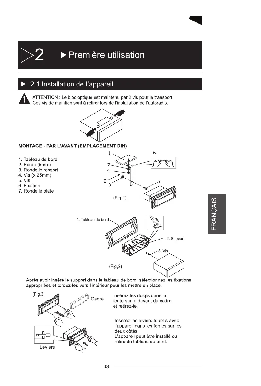 - Appuyez sur cette touche pour commuter sur la bande FM désiré (Fm1, Fm2, fm3) /PLAY ou faire une PAUSE pendant une lecture. - Appuyez sur cette touche pour activer la fonction SUBWOOFER disponible sur les sorties RCA à l’arrière de l’auto radio.