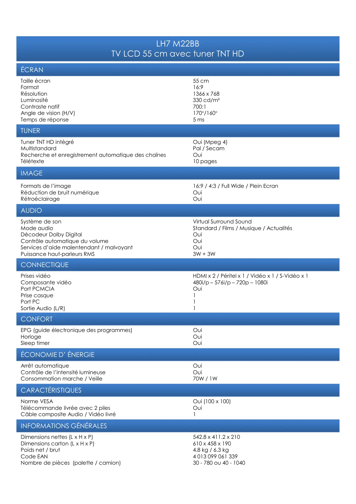 LH7 M22BB TV LCD 55 cm avec tuner TNT HD ÉCRAN Taille écran Format Résolution Luminosité Contraste natif Angle de vision (H/V) Temps de réponse 55 cm 16:9 1366 x 768 330 cd/m² 700:1 170°/160° 5 ms TUNER Tuner TNT HD intégré Multistandard Recherche et enregistrement automatique des chaînes Télétexte Oui (Mpeg 4) Pal / Secam Oui 10 pages IMAGE Formats de l’image Réduction de bruit numérique Rétroéclairage 16:9 / 4:3 / Full Wide / Plein Ecran Oui Oui AUDIO Système de son Mode audio Décodeur Dolby Digital Contrôle automatique du volume Services d’aide malentendant / malvoyant Puissance haut-parleurs RMS Virtual Surround Sound Standard / Films / Musique / Actualités Oui Oui Oui 3W + 3W CONNECTIQUE Prises vidéo Composante vidéo Port PCMCIA Prise casque Port PC Sortie Audio (L/R) HDMI x 2 / Péritel x 1 / Vidéo x 1 / S-Vidéo x 1 480i/p – 576i/p – 720p – 1080i Oui
