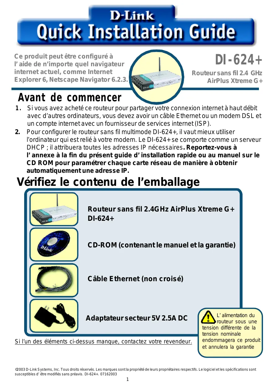 l’ordinateur qui est relié à votre modem. Le DI-624+ se comporte comme un serveur DHCP ; il attribuera toutes les adresses IP nécessaires. Reportez-vous à l’annexe à la fin du présent guide d’installation rapide ou au manuel sur le CD ROM pour paramétrer chaque carte réseau de manière à obtenir automatiquement une adresse IP. Vérifiez le contenu de l’emballage Routeur sans fil 2.4GHz AirPlus Xtreme G+ DI-624+ CD-ROM (contenant le manuel et la garantie) Câble Ethernet (non croisé) Adaptateur secteur 5V 2.5A DC Si l’un des éléments ci-dessus manque, contactez votre revendeur. L’alimentation du routeur sous une tension différente de la tension nominale endommagera ce produit et annulera la garantie ©2003 D-Link Systems, Inc. Tous droits réservés. Les marques sont la propriété de leurs propriétaires respectifs. Le logiciel et les spécifications sont susceptibles d’être modifiés sans préavis. DI-624+. 07162003
