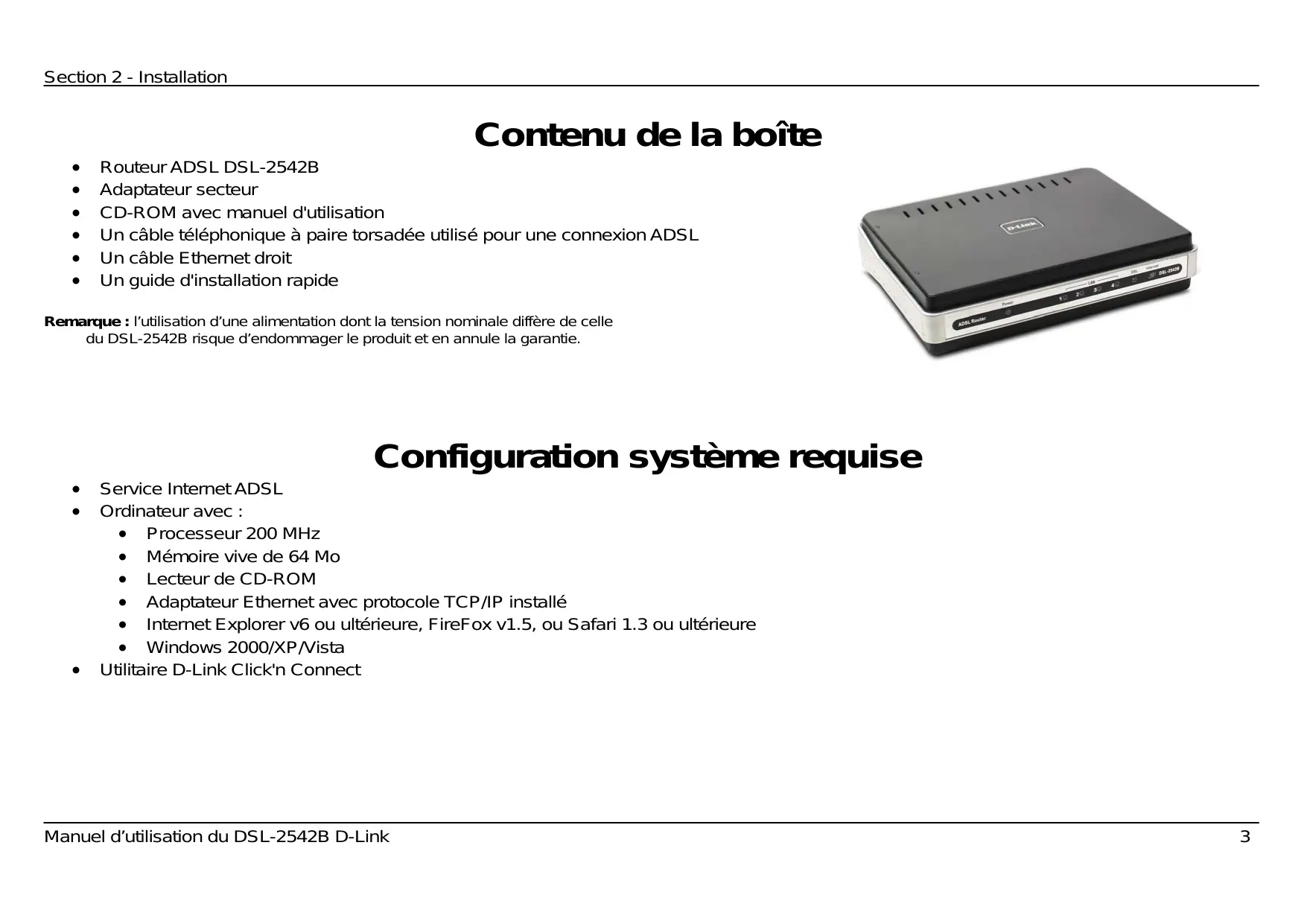 Routeur ADSL DSL-2542B Adaptateur secteur CD-ROM avec manuel d'utilisation Un câble téléphonique à paire torsadée utilisé pour une connexion ADSL Un câble Ethernet droit Un guide d'installation rapide Remarque : l’utilisation d’une alimentation dont la tension nominale diffère de celle du DSL-2542B risque d’endommager le produit et en annule la garantie. Configuration système requise