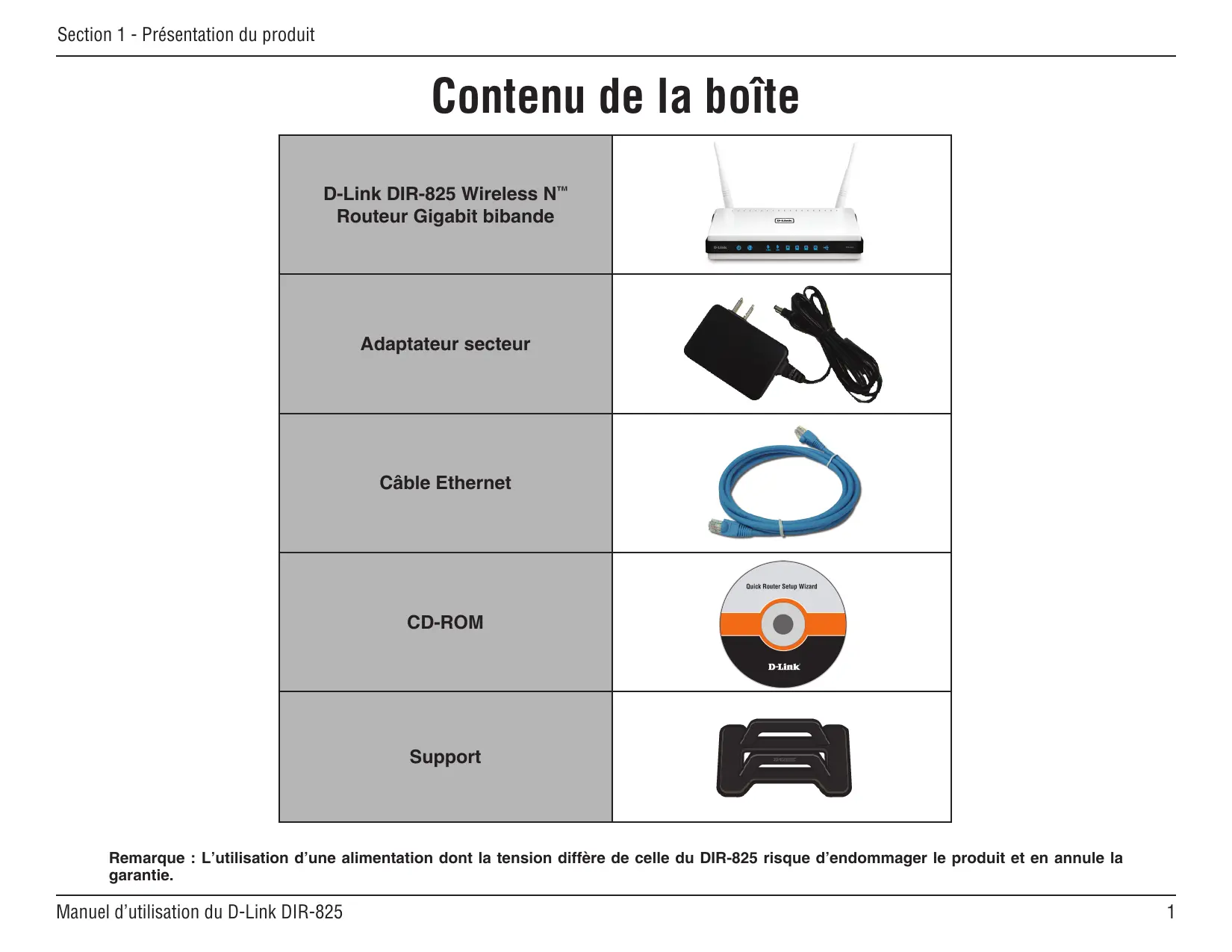 Product Overview Contenu de la boîte D-Link DIR-825 Wireless N™ Routeur Gigabit bibande Adaptateur secteur Câble Ethernet CD-ROM Support Remarque : L’utilisation d’une alimentation dont la tension diffère de celle du DIR-825 risque d’endommager le produit et en annule la garantie. Manuel d’utilisation du D-Link DIR-825