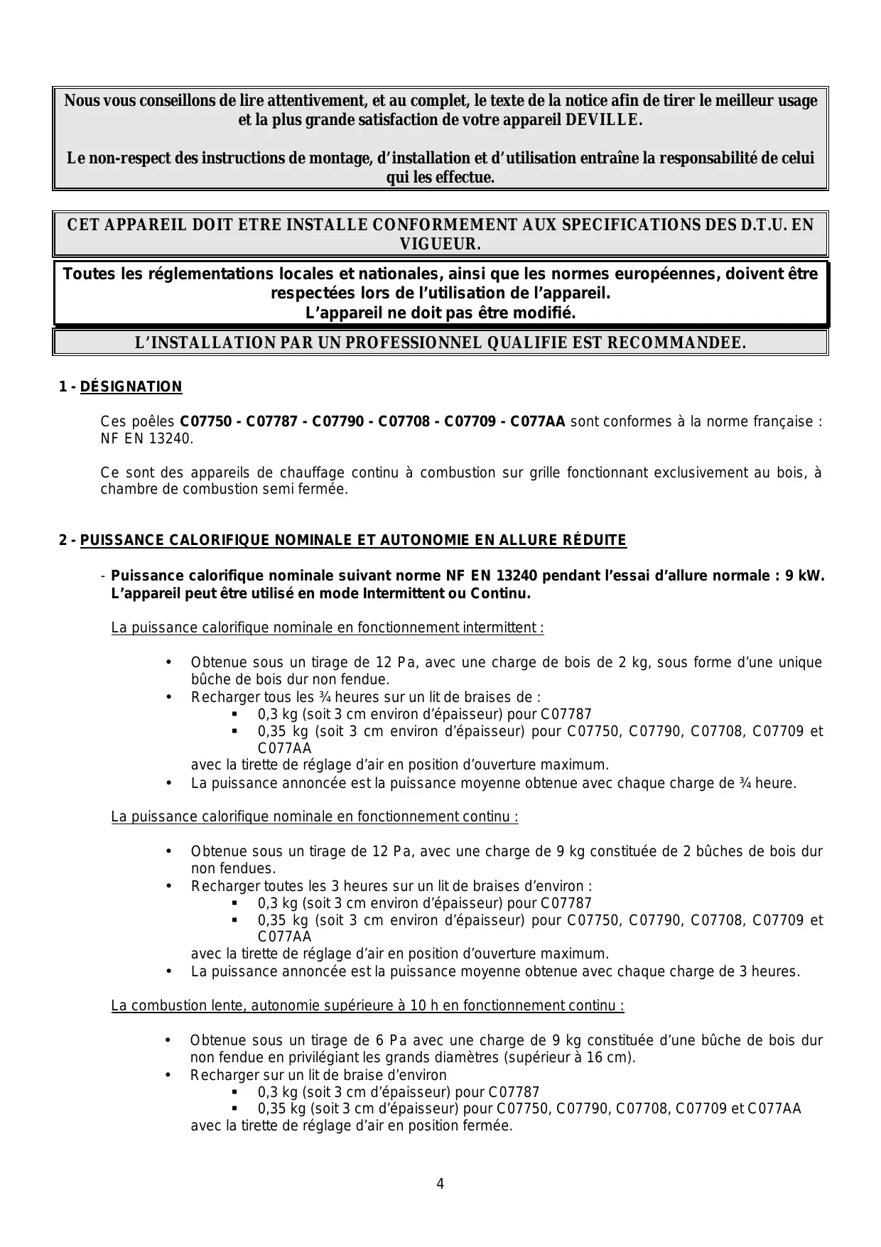 Ces poêles C07750 - C07787 - C07790 - C07708 - C07709 - C077AA sont conformes à la norme française : NF EN 13240. Ce sont des appareils de chauffage continu à combustion sur grille fonctionnant exclusivement au bois, à chambre de combustion semi fermée.