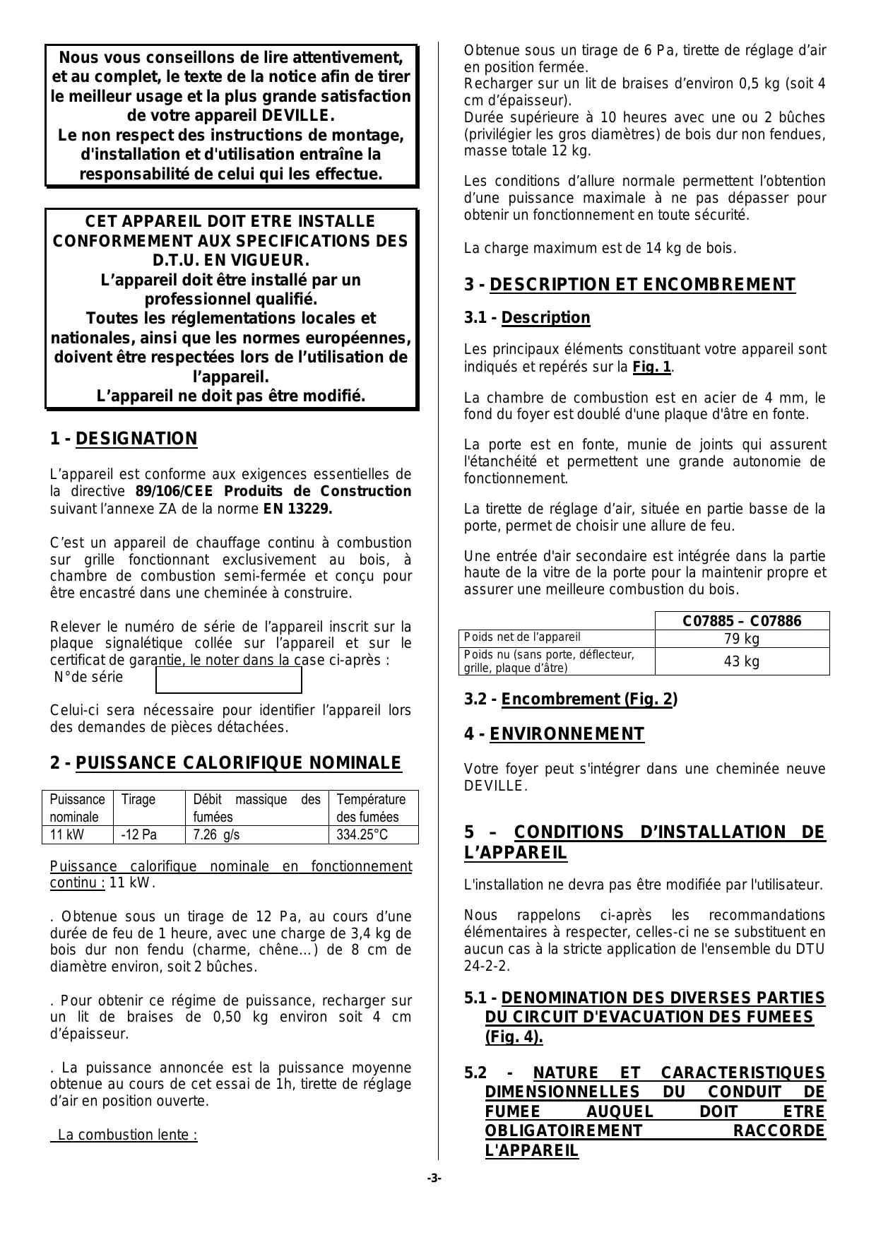 9 - CONDITIONS GENERALES DE GARANTIE .............................................................................................. 10 -3-2- Obtenue sous un tirage de 6 Pa, tirette de réglage d’air en position fermée. Recharger sur un lit de braises d’environ 0,5 kg (soit 4 cm d’épaisseur). Durée supérieure à 10 heures avec une ou 2 bûches (privilégier les gros diamètres) de bois dur non fendues, masse totale 12 kg. Nous vous conseillons de lire attentivement, et au complet, le texte de la notice afin de tirer le meilleur usage et la plus grande satisfaction de votre appareil DEVILLE. Le non respect des instructions de montage, d'installation et d'utilisation entraîne la responsabilité de celui qui les effectue. Les conditions d’allure normale permettent l’obtention d’une puissance maximale à ne pas dépasser pour obtenir un fonctionnement en toute sécurité.