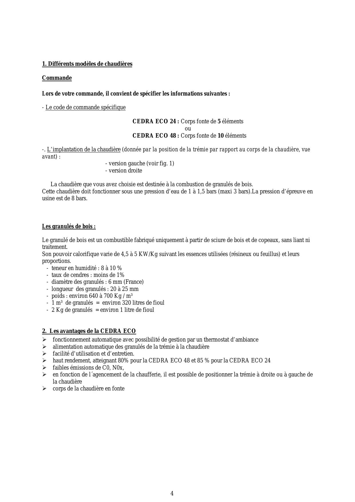 Commande Lors de votre commande, il convient de spécifier les informations suivantes : - Le code de commande spécifique CEDRA ECO 24 : Corps fonte de 5 éléments CEDRA ECO 48 : Corps fonte de 10 éléments -. L’implantation de la chaudière (donnée par la position de la trémie par rapport au corps de la chaudière, vue avant) : - version gauche (voir fig. 1) - version droite La chaudière que vous avez choisie est destinée à la combustion de granulés de bois. Cette chaudière doit fonctionner sous une pression d’eau de 1 à 1,5 bars (maxi 3 bars).La pression d’épreuve en usine est de 8 bars. Les granulés de bois : Le granulé de bois est un combustible fabriqué uniquement à partir de sciure de bois et de copeaux, sans liant ni traitement. Son pouvoir calorifique varie de 4,5 à 5 KW/Kg suivant les essences utilisées (résineux ou feuillus) et leurs proportions. - teneur en humidité : 8 à 10 % - taux de cendres : moins de 1% - diamètre des granulés : 6 mm (France) - longueur des granulés : 20 à 25 mm - poids : environ 640 à 700 Kg / m³ - 1 m³ de granulés = environ 320 litres de fioul - 2 Kg de granulés = environ 1 litre de fioul