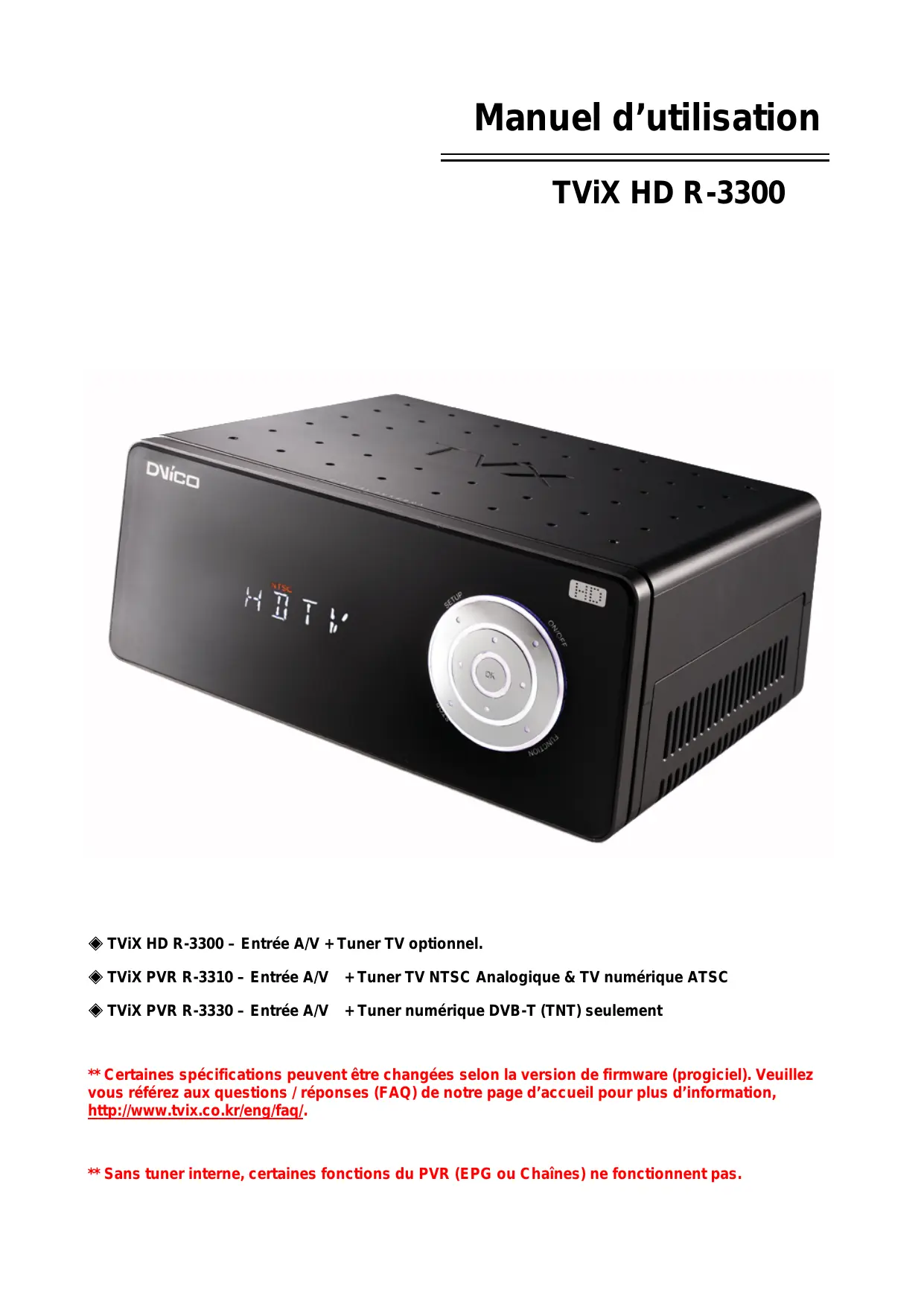 - DVICO Inc n’a pas de responsabilité sur les programmes enregistrés, les fichiers réalisés, ou distribués à des fins illégales, commerciales, ou d’activités transactionnelles. La partie ou les parties qui enregistrent ou distribuent le contenu porte toutes les responsabilités (civile ou criminelle) directe ou indirecte. ◈ TViX HD R-3300 – Entrée A/V + tuner TNT optionnel. ** ◈ TViX PVR R-3310 – Entrée A/V + Tuner analogique NTSC & numérique ATSC. ◈ TViX PVR R-3330 – Entrée A/V + Tuner DVB-T (TNT) (TV analogique non supporté) ** Sans le tuner optionnel certaines fonctions du PVR (EPG, ou chaînes) ne fonctionneront pas.