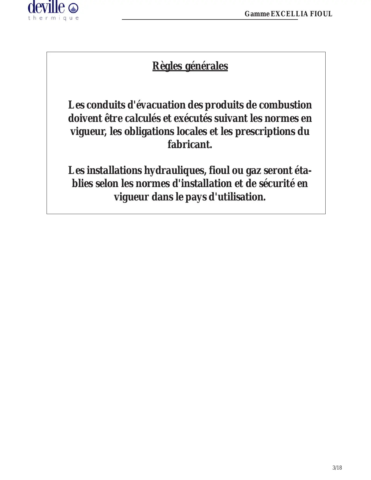 ENTRETIEN .......................................................................................................... 1 7 Gamme EXCELLIA FIOUL Règles générales Les conduits d'évacuation des produits de combustion doivent être calculés et exécutés suivant les normes en vigueur, les obligations locales et les prescriptions du fabricant. Les installations hydrauliques, fioul ou gaz seront établies selon les normes d'installation et de sécurité en vigueur dans le pays d'utilisation. 3/18 Gamme EXCELLIA FIOUL