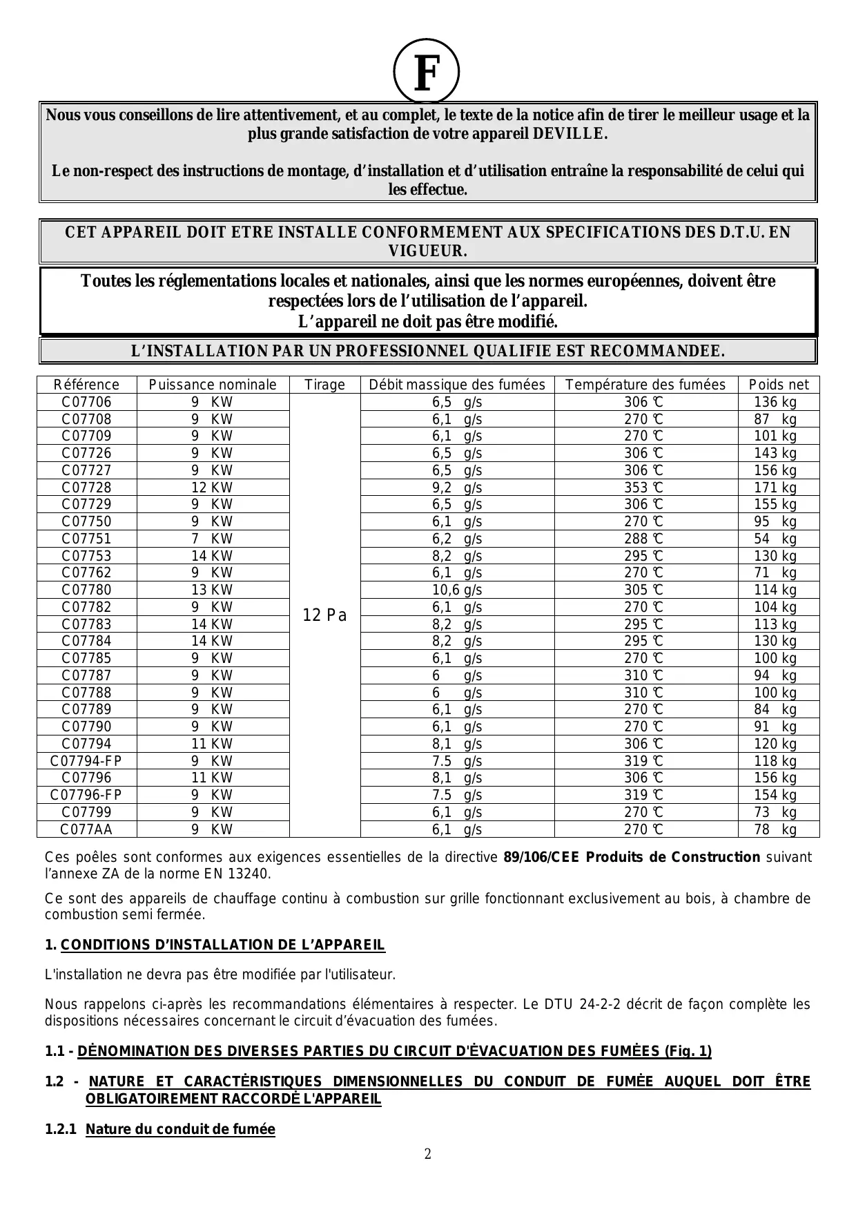 L’appareil ne doit pas être modifié. L’INSTALLATION PAR UN PROFESSIONNEL QUALIFIE EST RECOMMANDEE. Référence C07706 C07708 C07709 C07726 C07727 C07728 C07729 C07750 C07751 C07753 C07762 C07780 C07782 C07783 C07784 C07785 C07787 C07788 C07789 C07790 C07794 C07794-FP C07796 C07796-FP C07799