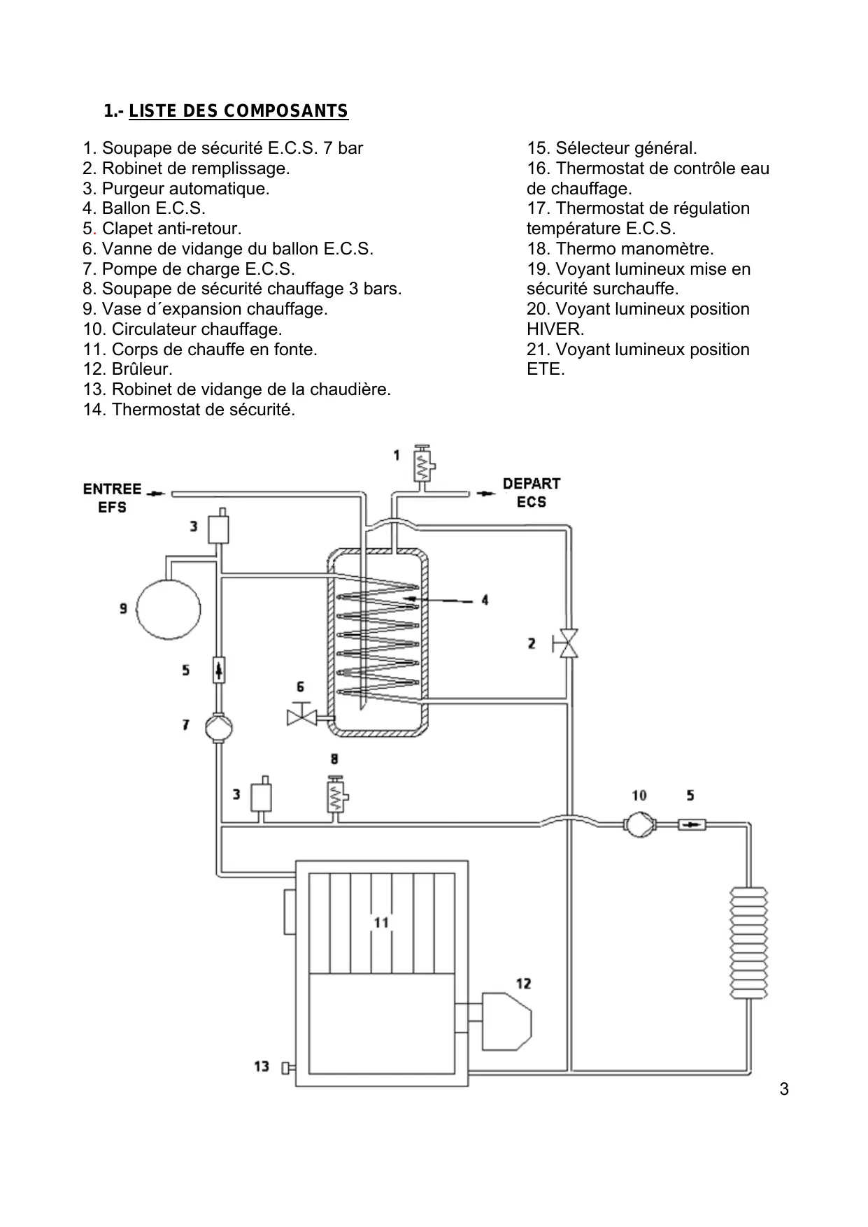 Sélecteur général (15): Il permet d’allumer et d’éteindre la chaudière. La position ‘’ ☼’’ permet de sélectionner le fonctionnement Eté (seulement pour la production de l’E.C.S). La position ‘’7’’ permet de sélectionner le fonctionnement Hiver (pour le chauffage et la production de l’E.C.S.). La position ‘’O’’ permet de mettre la chaudière à l’arrêt. Thermostat de contrôle chauffage TC (16): Il permet de sélectionner la température de consigne de l’eau de chauffage Thermostat de régulation E.C.S. TECS (17): Il permet de sélectionner la température de l’eau chaude sanitaire. Thermo manomètre (18): Indique la température et la pression de l’eau de chauffage de la chaudière. Thermostat de sécurité de surchauffe TS (14): Au delà de 110°C, met la chaudière en sécurité (coupure du brûleur). Thermostat à réarmement manuel. Thermostat limiteur sanitaire TF 4 : Situé à l’intérieur du tableau, il arrête la chaudière à 80°C en fonctionnement sanitaire Thermostat anti inertie chauffage TF3 : Situé à l’intérieur du tableau, il démarre la pompe de chauffage en cas de coupure par thermostat d’ambiance et si la température de la chaudière dépasse 93°C