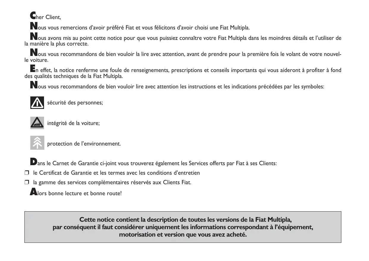 n effet, la notice renferme une foule de renseignements, prescriptions et conseils importants qui vous aideront à profiter à fond des qualités techniques de la Fiat Multipla. Nous vous recommandons de bien vouloir lire avec attention les instructions et les indications précédées par les symboles: sécurité des personnes; intégrité de la voiture; protection de l’environnement. Dans le Carnet de Garantie ci-joint vous trouverez également les Services offerts par Fiat à ses Clients: ❒ le Certificat de Garantie et les termes avec les conditions d’entretien ❒ la gamme des services complémentaires réservés aux Clients Fiat. Alors bonne lecture et bonne route! Cette notice contient la description de toutes les versions de la Fiat Multipla, par conséquent il faut considérer uniquement les informations correspondant à l’équipement, motorisation et version que vous avez acheté. A LIRE ABSOLUMENT!
