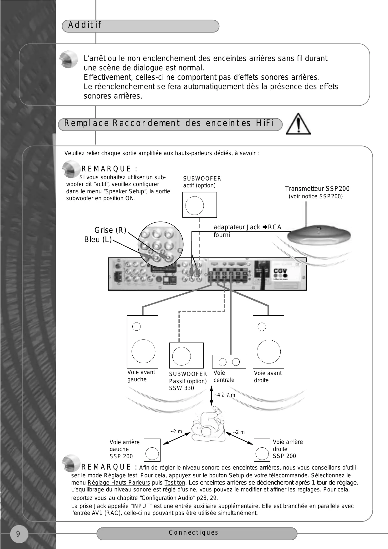 Si vous souhaitez utiliser un subwoofer dit "actif", veuillez configurer dans le menu "Speaker Setup", la sortie subwoofer en position ON.