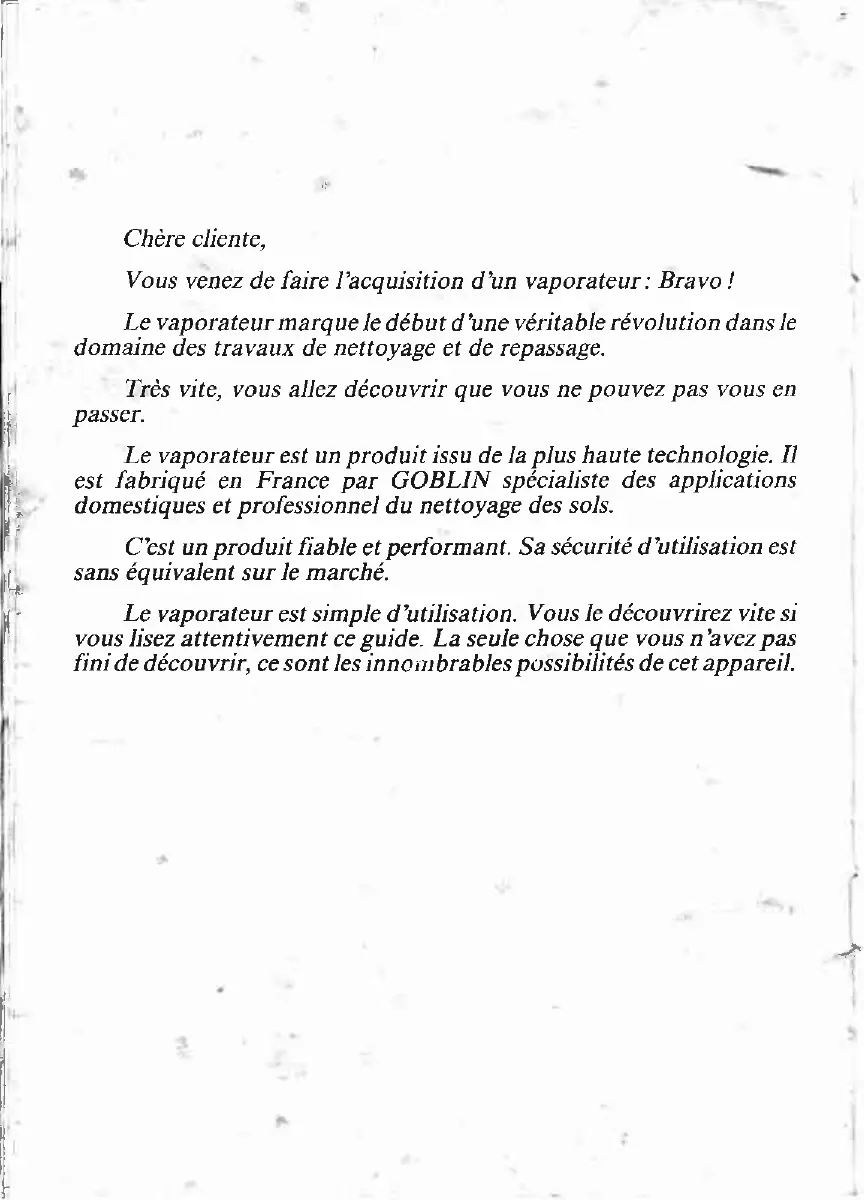 Très vite, vousallez découvrirque vousne pouvezpas vousen passeL Le vaporateurestun produit issudeIa plushautetechnologie.Il est fabriqué en France par GOBLIN spécialistedes applications domestiqueset professionneldu nettoyagedesso1s. C'estunproduit îiable et performant.Sa sécuritéd'utilisationest sanséquivalentsurle marché. Le vaporateurestsimpled'utilisation. Vousle découvrirezvitesi vous|isezattentivementceguide. La seulechoseque vousn'avezpas fini dedécouvrir,cesontlesinnoinbrablespossibilitésdecetappareil.