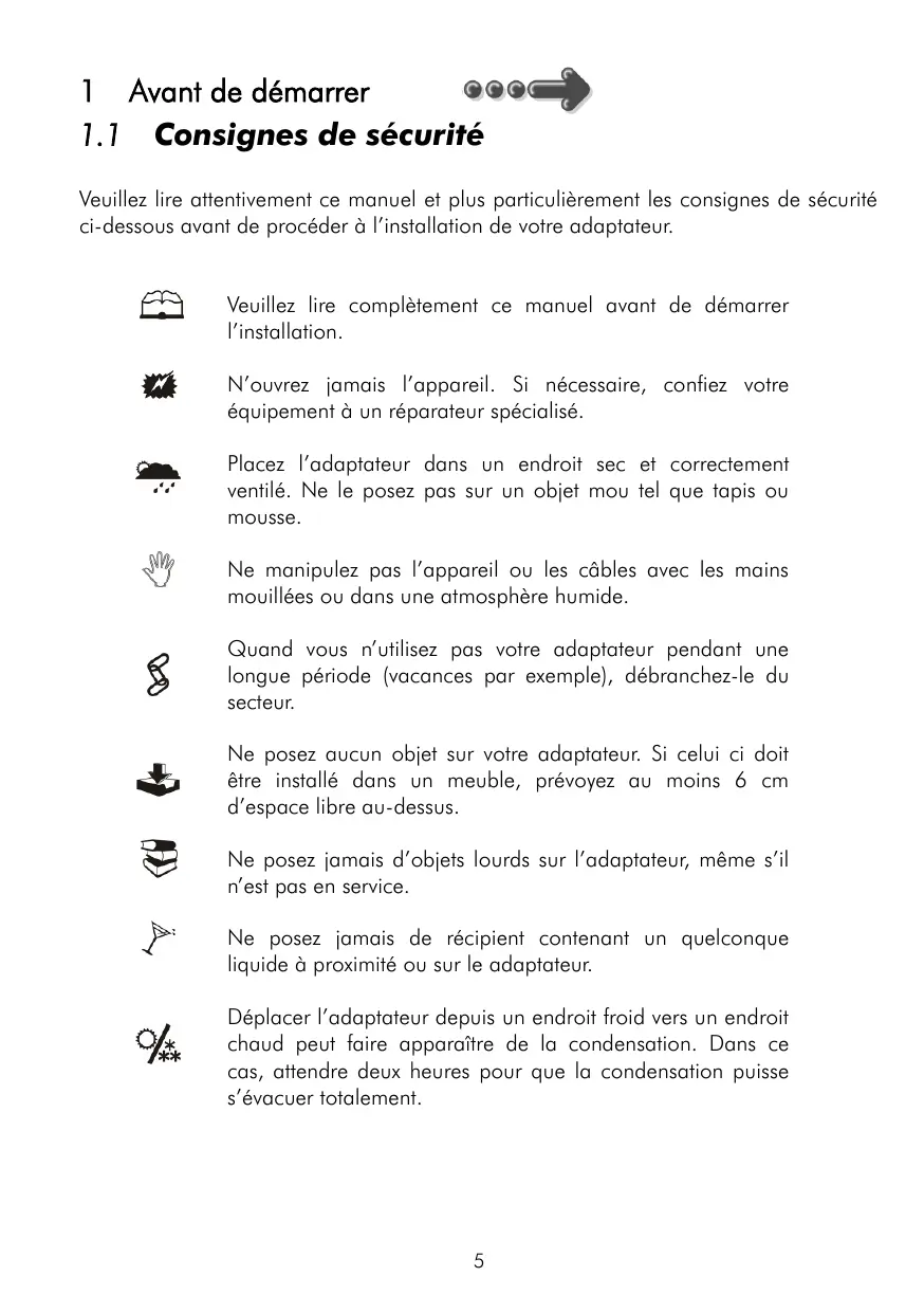 Veuillez lire attentivement ce manuel et plus particulièrement les consignes de sécurité ci-dessous avant de procéder à l’installation de votre adaptateur. Veuillez lire complètement ce manuel avant de démarrer l’installation. N’ouvrez jamais l’appareil. Si nécessaire, confiez votre équipement à un réparateur spécialisé. Placez l’adaptateur dans un endroit sec et correctement ventilé. Ne le posez pas sur un objet mou tel que tapis ou mousse. Ne manipulez pas l’appareil ou les câbles avec les mains mouillées ou dans une atmosphère humide. Quand vous n’utilisez pas votre adaptateur pendant une longue période (vacances par exemple), débranchez-le du secteur. Ne posez aucun objet sur votre adaptateur. Si celui ci doit être installé dans un meuble, prévoyez au moins 6 cm d’espace libre au-dessus. Ne posez jamais d’objets lourds sur l’adaptateur, même s’il n’est pas en service. Ne posez jamais de récipient contenant un quelconque liquide à proximité ou sur le adaptateur. Déplacer l’adaptateur depuis un endroit froid vers un endroit chaud peut faire apparaître de la condensation. Dans ce cas, attendre deux heures pour que la condensation puisse s’évacuer totalement.