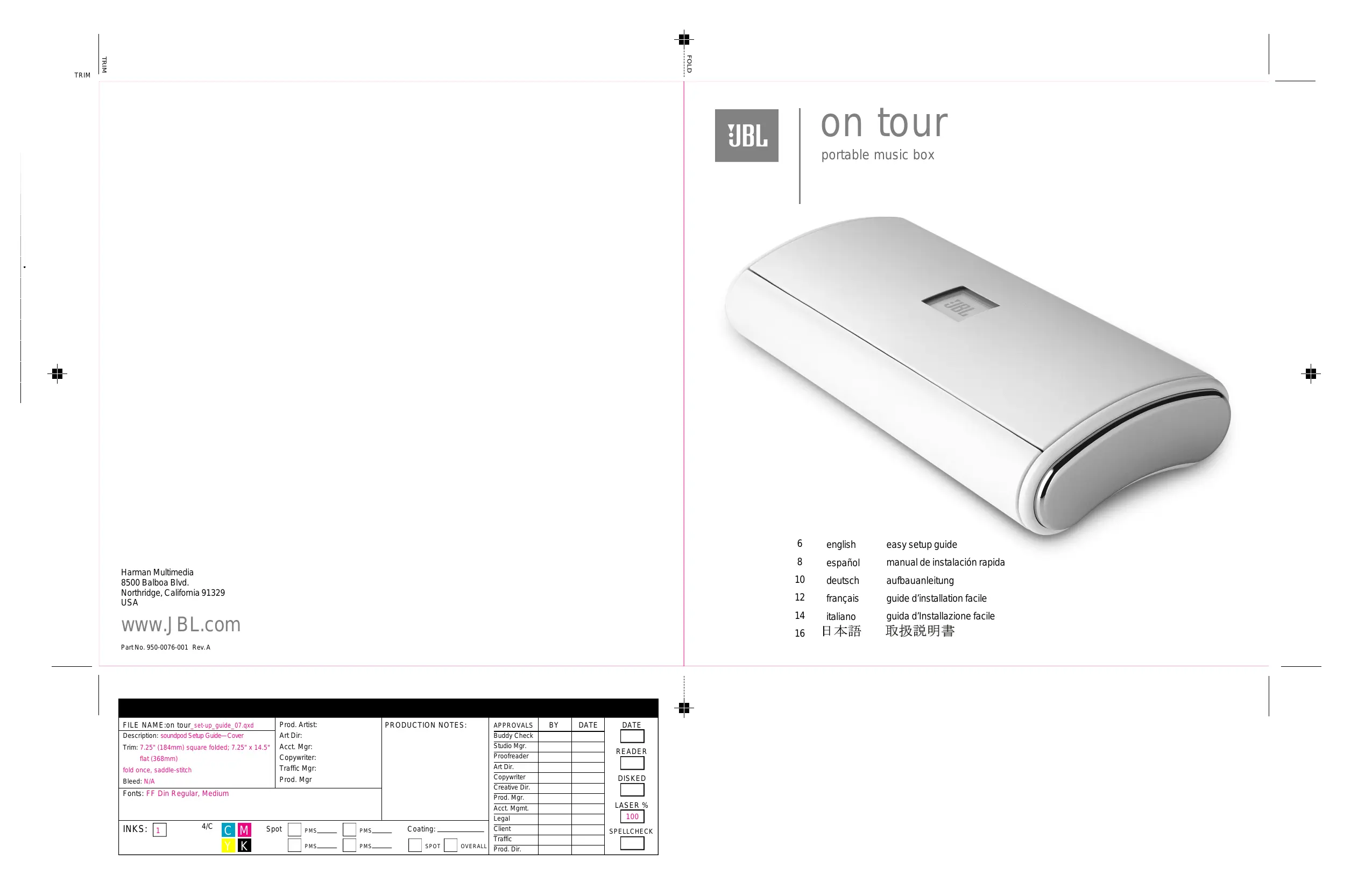 alla manutenzione, riferirsi al Technical Support Group (gruppo di assistenza tecnica) di JBL. Non esporre il prodotto a estremi di temperatura o di umidità o alla luce diretta del sole, ad ambiente eccessivamente polveroso o a vibrazioni. Sistemare il prodotto su di una superficie stabile e piana. Non fare cadere il prodotto, evitare di esercitare pressione eccessiva sui comandi e non mettere oggetti pesanti sopra gli altoparlanti. Se si rende necessario pulire il prodotto, usare un panno soffice asciutto. Se fosse necessario, inumidire il panno senza usare sostanze solventi. Per proteggere il sistema degli altoparlanti, evitare le reazioni di microfono, la potenza continua di strumenti musicali elettronici o segnali di uscita distorti provenienti da qualsiasi sorgente. Non sistemare gli altoparlanti in vicinanza di fonti di luce fluorescente o di luci al neon. Anche se gli altoparlanti siano dotati di schermatura magnetica, si suggerisce di mantenere i supporti magnetici di dati (nastri e dischi) ad una distanza di almeno 4 pollici (10 cm) dal prodotto, per evitare la perdita di dati. AVVERTENZA: per ridurre il rischio di incendio o di scossa elettrica, non esporre questa apparecchiatura a pioggia o bagnato. on tour N’enlevez jamais les grilles de haut-parleurs pour réparer les enceintes. Aucune pièce interne ne peut être réparée par l’utilisateur. Adressez-vous au service d’assistance technique de JBL pour tous les entretiens et réparations. N’exposez pas les enceintes à des températures ou taux d’humidité extrêmes, aux rayons du soleil, ni à une poussière ou à des vibrations excessives. Placez les enceintes sur une surface stable et plane. Faites attention à ne pas les laisser tomber, ne forcez pas les commandes et ne placez pas d’objets lourds sur les enceintes. Au besoin, nettoyez les enceintes avec un chiffon doux sec. Si nécessaire, utilisez un chiffon humide mais sans aucun solvant. Pour protéger les enceintes, évitez le larsen, les signaux prolongés d’instruments de musique électronique ou les signaux distordus de quelque source que ce soit. Ne placez pas les enceintes à proximité d’éclairages fluorescents ou au néon. Bien que les enceintes soient pourvues d’un blindage antimagnétique, n’approchez pas les supports d’enregistrement magnétique (disques et bandes) à moins de 10 cm afin d’éviter des pertes de données.