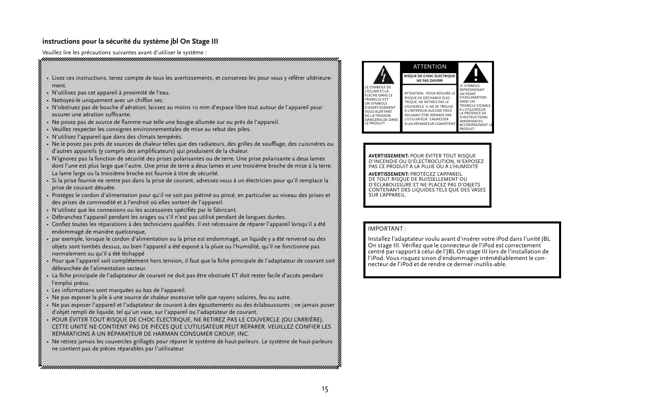instructions pour la sécurité du système jbl On Stage III Veuillez lire les précautions suivantes avant d’utiliser le système :