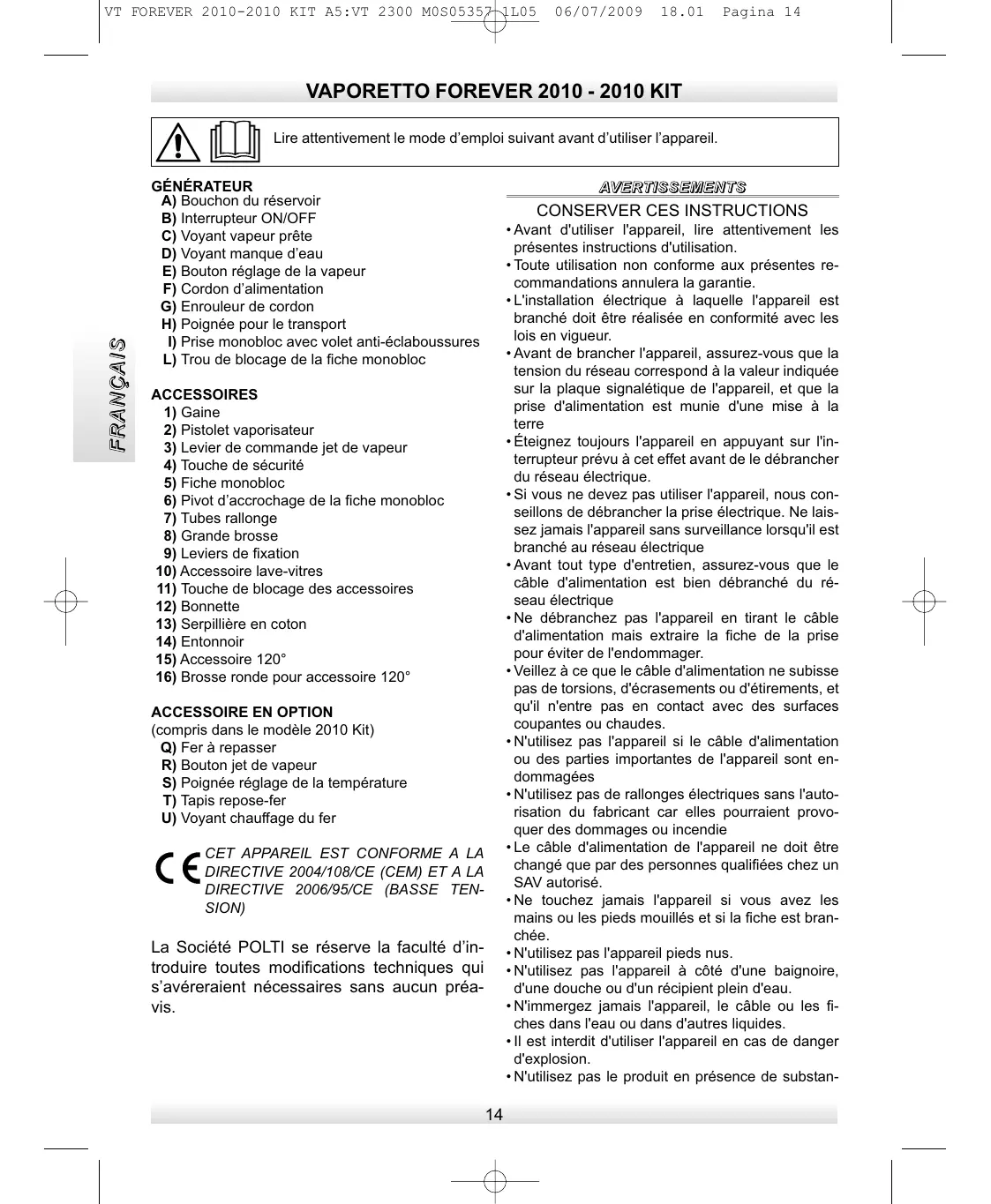 DIRECTIVE 2006/95/CE (BASSE TENSION) La Société POLTI se réserve la faculté d’introduire toutes modifications techniques qui s’avéreraient nécessaires sans aucun préavis.