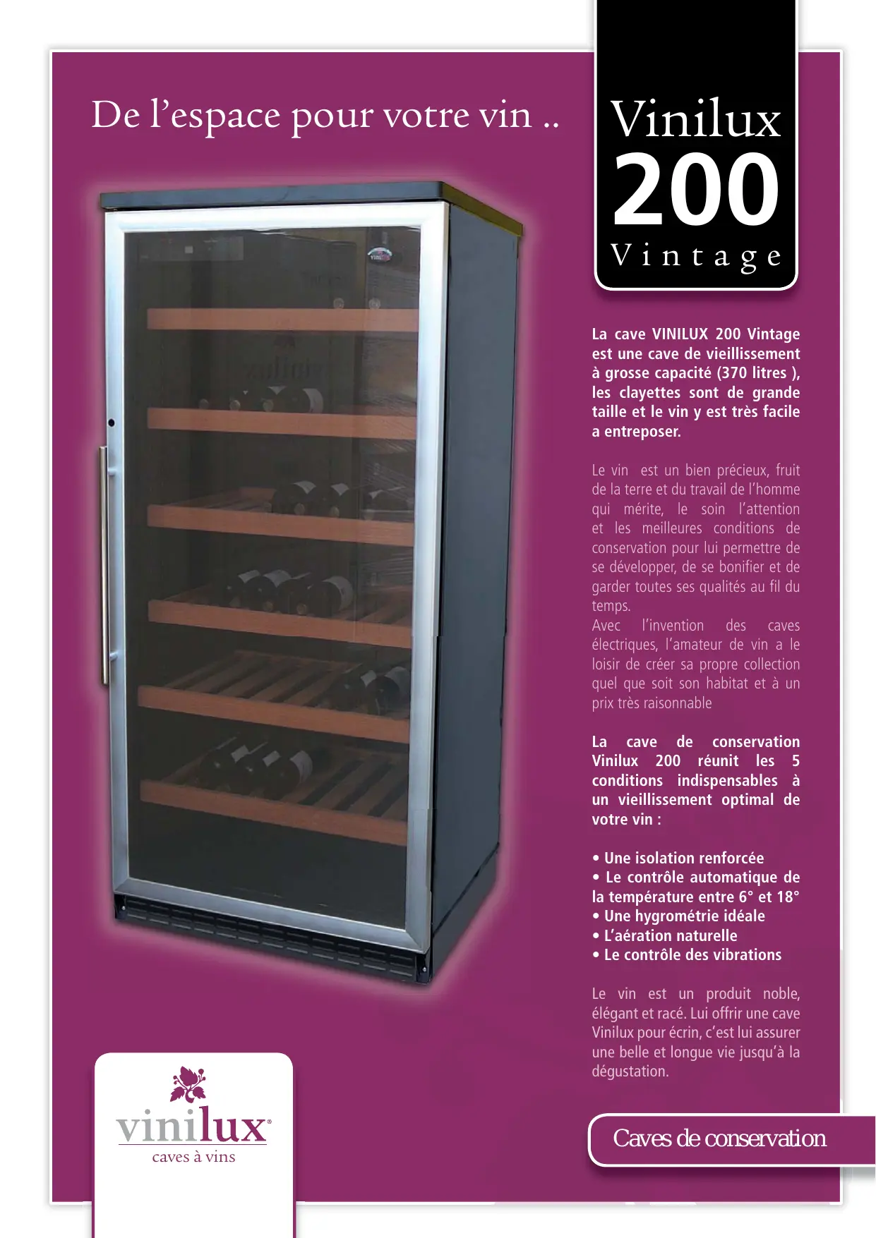 Vintage La cave VINILUX 200 Vintage est une cave de vieillissement à grosse capacité (370 litres ), les clayettes sont de grande taille et le vin y est très facile a entreposer. Le vin est un bien précieux, fruit de la terre et du travail de l’homme qui mérite, le soin l’attention et les meilleures conditions de conservation pour lui permettre de se développer, de se bonifier et de garder toutes ses qualités au fil du temps. Avec l’invention des caves électriques, l’amateur de vin a le loisir de créer sa propre collection quel que soit son habitat et à un prix très raisonnablee. La cave de conservation Vinilux 200 réunit les 5 conditions indispensables à un vieillissement optimal de votre vin :