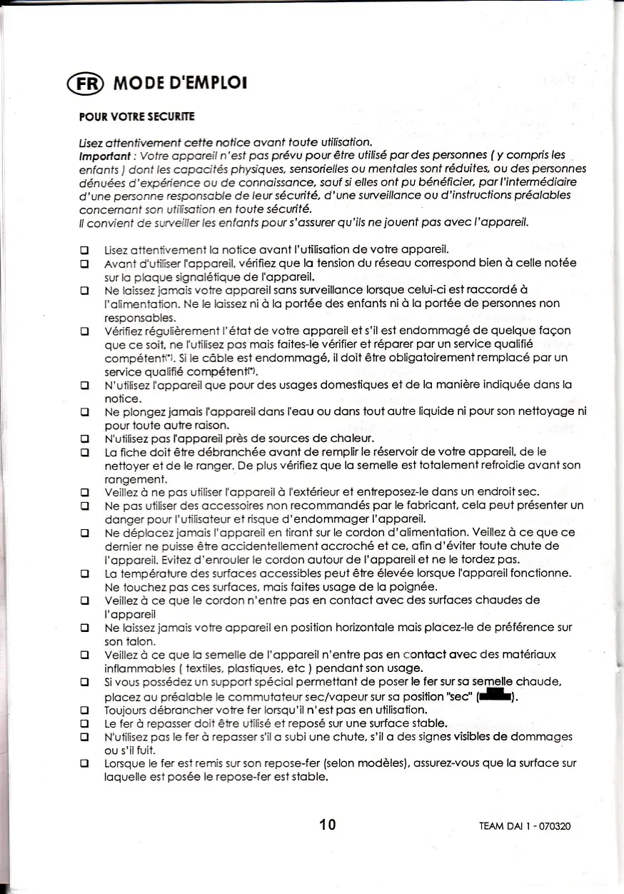 DAI 1 - Fer à repasser TEAM INTERNATIONAL - Notice d'utilisation et mode d'emploi gratuit