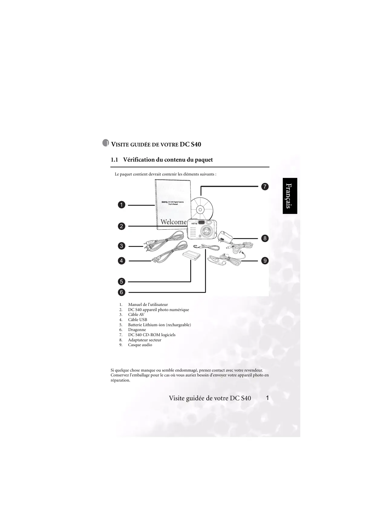 Manuel de l'utilisateur DC S40 appareil photo numérique Câble AV Câble USB Batterie Lithium-ion (rechargeable) Dragonne DC S40 CD-ROM logiciels Adaptateur secteur Casque audio Si quelque chose manque ou semble endommagé, prenez contact avec votre revendeur. Conservez l'emballage pour le cas où vous auriez besoin d'envoyer votre appareil photo en réparation. Visite guidée de votre DC S40