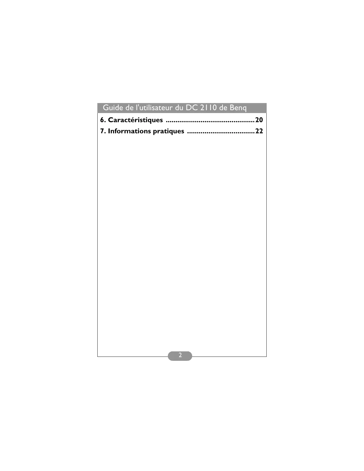 Guide de l'utilisateur du DC 2110 de Benq Précautions d'utilisation Cet appareil est un instrument électronique délicat. Gardez-le à l'écart de :