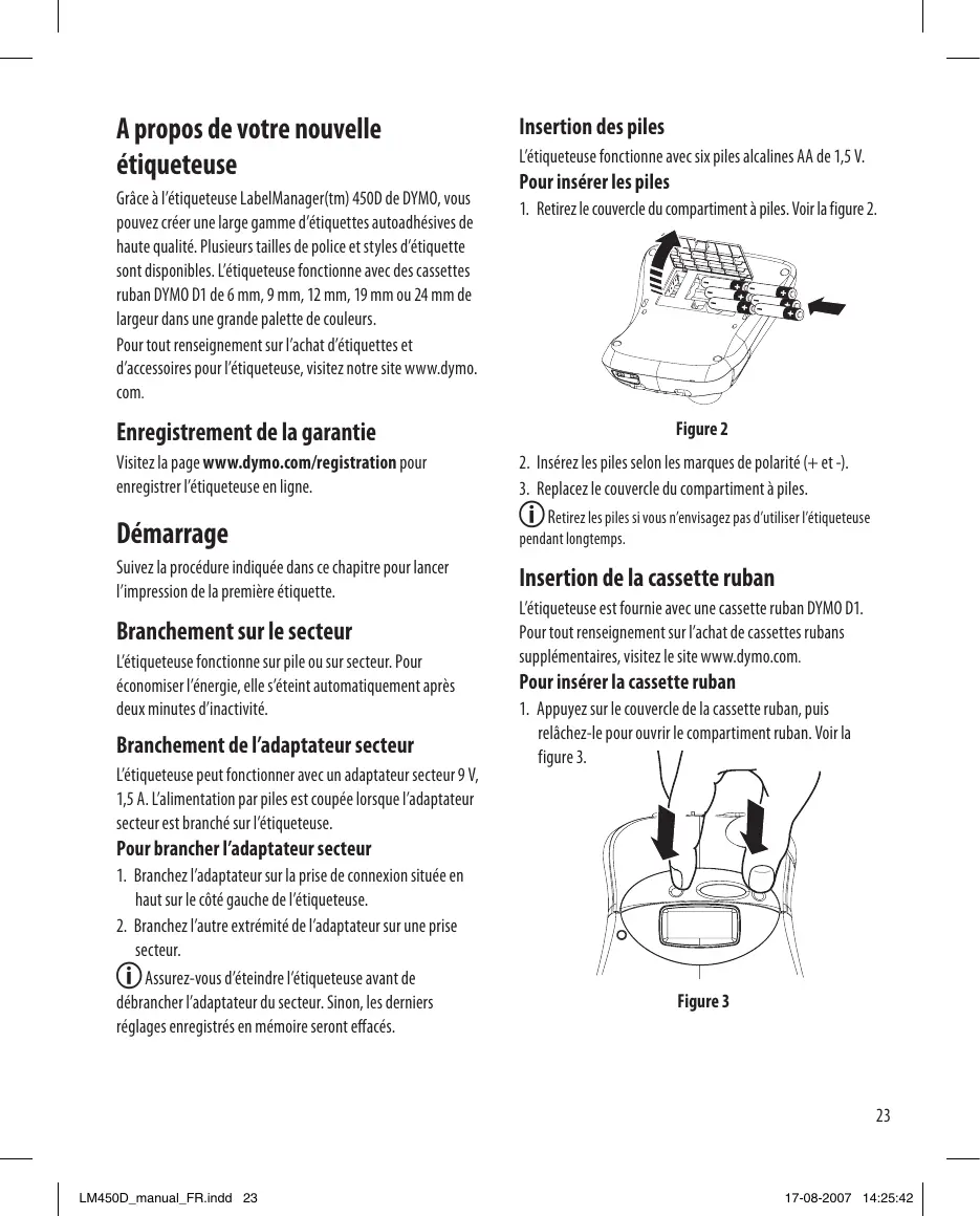 LM450D_manual_FR.indd 22 17-08-2007 14:25:42 A propos de votre nouvelle étiqueteuse Grâce à l’étiqueteuse LabelManager(tm) 450D de DYMO, vous pouvez créer une large gamme d’étiquettes autoadhésives de haute qualité. Plusieurs tailles de police et styles d’étiquette sont disponibles. L’étiqueteuse fonctionne avec des cassettes ruban DYMO D1 de 6 mm, 9 mm, 12 mm, 19 mm ou 24 mm de largeur dans une grande palette de couleurs. Pour tout renseignement sur l’achat d’étiquettes et d’accessoires pour l’étiqueteuse, visitez notre site www.dymo. com. Insertion des piles L’étiqueteuse fonctionne avec six piles alcalines AA de 1,5 V. Pour insérer les piles