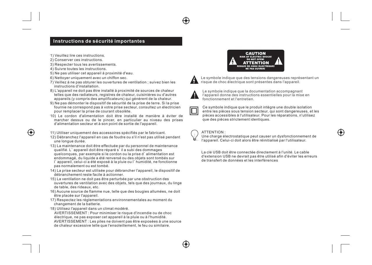 de chaleur excessive telle que l'ensoleillement, le feu ou similaire. Le symbole indique que des tensions dangereuses représentant un risque de choc électrique sont présentes dans l'appareil. Le symbole indique que la documentation accompagnant l'appareil donne des instructions essentielles pour la mise en fonctionnement et l'entretien. Ce symbole indique que le produit intègre une double isolation entre les pièces sous tension secteur, qui sont dangereuses, et les pièces accessibles à l'utilisateur. Pour les réparations, n'utilisez que des pièces strictement identiques. ATTENTION : Une charge électrostatique peut causer un dysfonctionnement de l'appareil. Celui-ci doit alors être réinitialisé par l'utilisateur. La clé USB doit être connectée directement à l'unité. Le cable d'extension USB ne devrait pas être utilisé afin d'éviter les erreurs de transfert de données et les interférences Table des matières Panneau avant et arrière