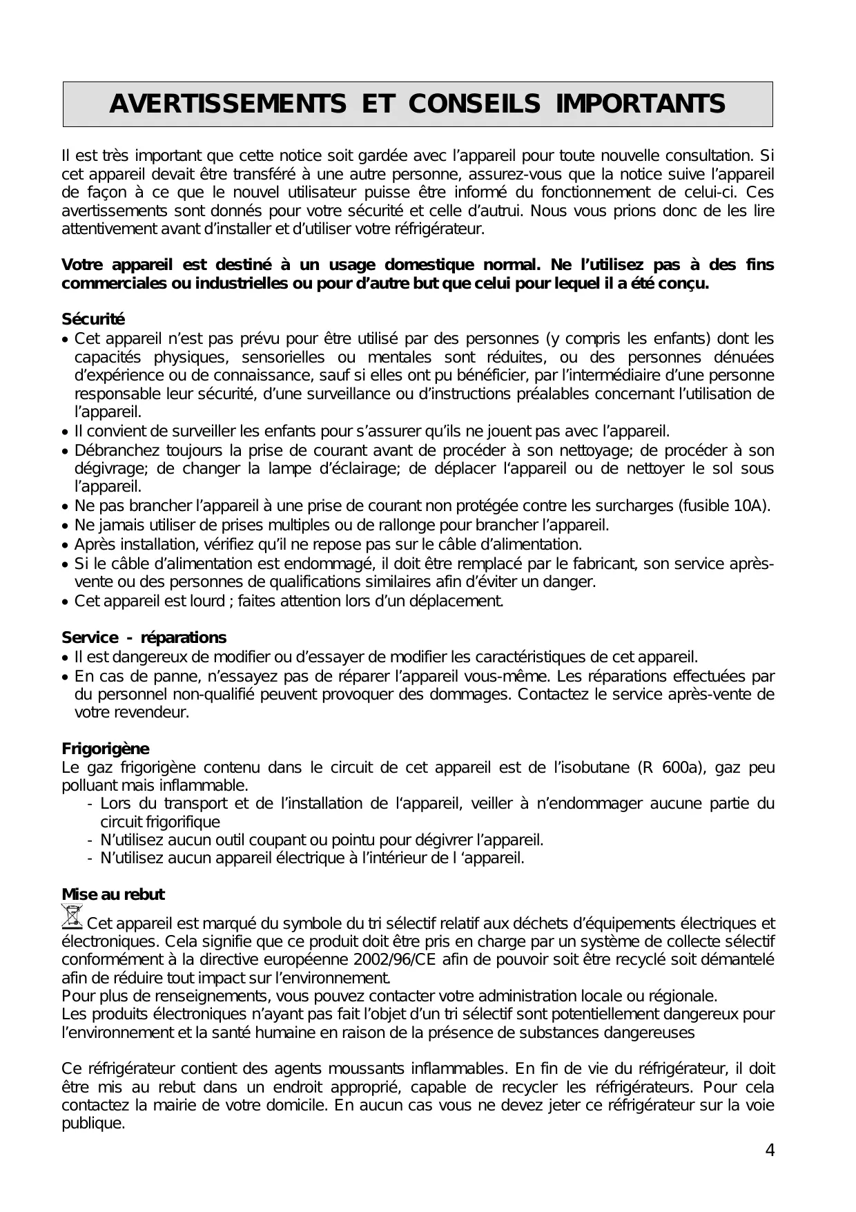 Le gaz frigorigène contenu dans le circuit de cet apparéil est de l'isobutane (R 600a), gaz peu polluant mais inflammable.