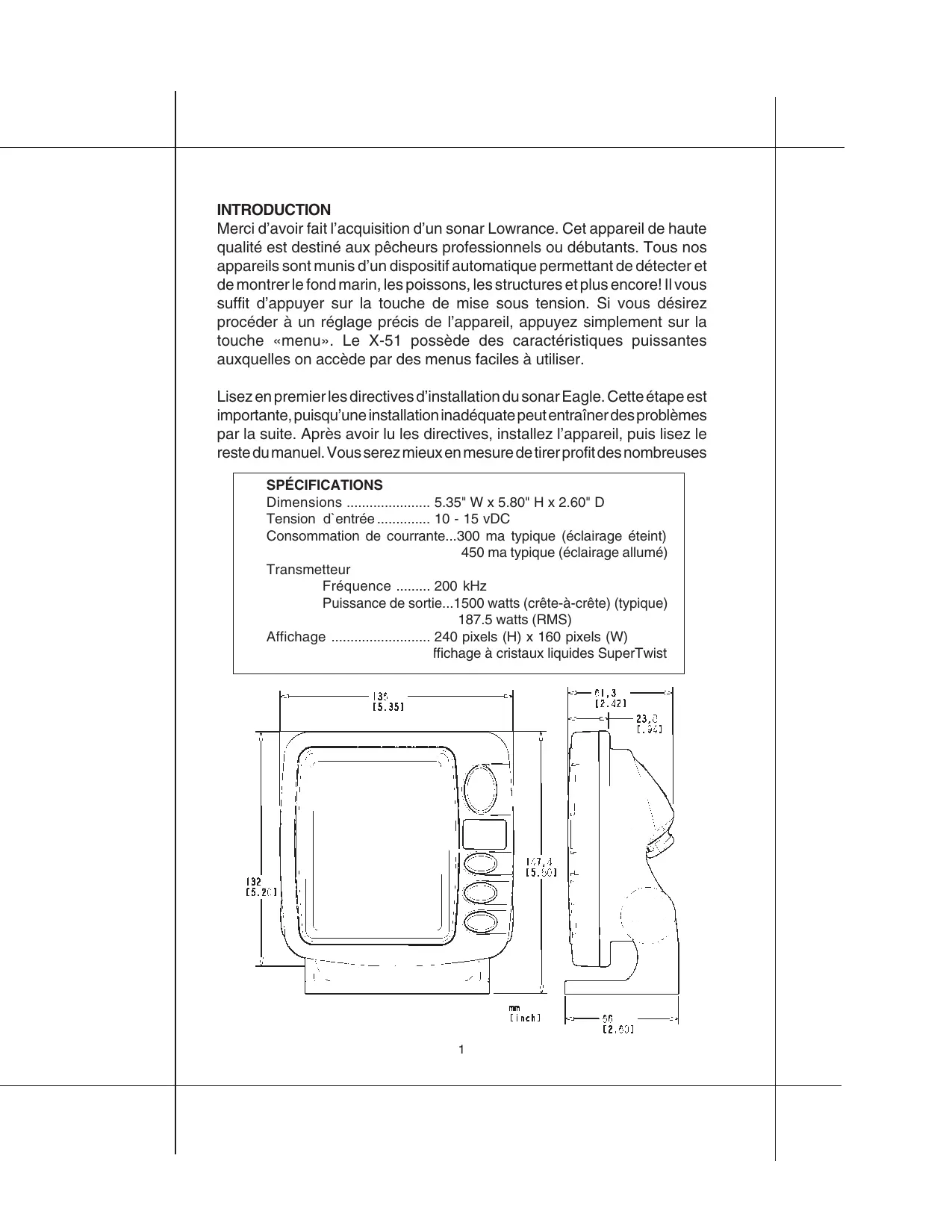 - INTRODUCTION Merci d’avoir fait l’acquisition d’un sonar Lowrance. Cet appareil de haute qualité est destiné aux pêcheurs professionnels ou débutants. Tous nos appareils sont munis d’un dispositif automatique permettant de détecter et de montrer le fond marin, les poissons, les structures et plus encore! Il vous suffit d’appuyer sur la touche de mise sous tension. Si vous désirez procéder à un réglage précis de l’appareil, appuyez simplement sur la touche «menu». Le X-51 possède des caractéristiques puissantes auxquelles on accède par des menus faciles à utiliser. Lisez en premier les directives d’installation du sonar Eagle. Cette étape est importante, puisqu’une installation inadéquate peut entraîner des problèmes par la suite. Après avoir lu les directives, installez l’appareil, puis lisez le reste du manuel. Vous serez mieux en mesure de tirer profit des nombreuses SPÉCIFICATIONS Dimensions p. 5