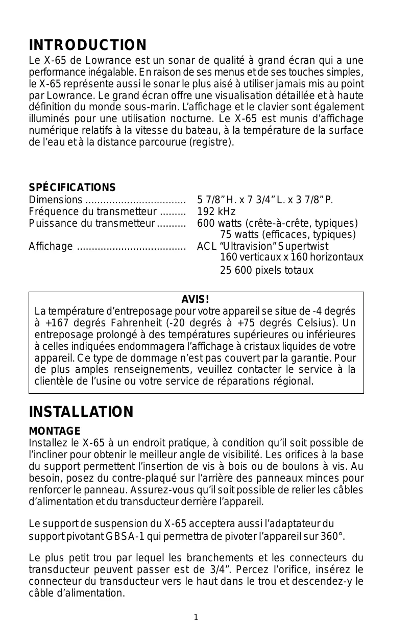 Copyright © 1996, Lowrance Electronics Tous droits réservés. Toutes les caractéristiqus et spécifications peuvent changer sans préavis. Tous les écrans de ce manuel sont simulés. INTRODUCTION Le X-65 de Lowrance est un sonar de qualité à grand écran qui a une performance inégalable. En raison de ses menus et de ses touches simples, le X-65 représente aussi le sonar le plus aisé à utiliser jamais mis au point par Lowrance. Le grand écran offre une visualisation détaillée et à haute définition du monde sous-marin. L’affichage et le clavier sont également illuminés pour une utilisation nocturne. Le X-65 est munis d’affichage numérique relatifs à la vitesse du bateau, à la température de la surface de l’eau et à la distance parcourue (registre). SPÉCIFICATIONS Dimensions .................................. 5 7/8” H. x 7 3/4” L. x 3 7/8” P. Fréquence du transmetteur ......... 192 kHz Puissance du transmetteur .......... 600 watts (crête-à-crête, typiques) 75 watts (efficaces, typiques) Affichage ..................................... ACL “Ultravision” Supertwist 160 verticaux x 160 horizontaux 25 600 pixels totaux AVIS! La température d’entreposage pour votre appareil se situe de -4 degrés à +167 degrés Fahrenheit (-20 degrés à +75 degrés Celsius). Un entreposage prolongé à des températures supérieures ou inférieures à celles indiquées endommagera l’affichage à cristaux liquides de votre appareil. Ce type de dommage n’est pas couvert par la garantie. Pour de plus amples renseignements, veuillez contacter le service à la clientèle de l’usine ou votre service de réparations régional. INSTALLATION MONTAGE Installez le X-65 à un endroit pratique, à condition qu’il soit possible de l’incliner pour obtenir le meilleur angle de visibilité. Les orifices à la base du support permettent l’insertion de vis à bois ou de boulons à vis. Au besoin, posez du contre-plaqué sur l’arrière des panneaux minces pour renforcer le panneau. Assurez-vous qu’il soit possible de relier les câbles d’alimentation et du transducteur derrière l’appareil. Le support de suspension du X-65 acceptera aussi l’adaptateur du support pivotant GBSA-1 qui permettra de pivoter l’appareil sur 360°. Le plus petit trou par lequel les branchements et les connecteurs du transducteur peuvent passer est de 3/4”. Percez l’orifice, insérez le connecteur du transducteur vers le haut dans le trou et descendez-y le câble d’alimentation.
