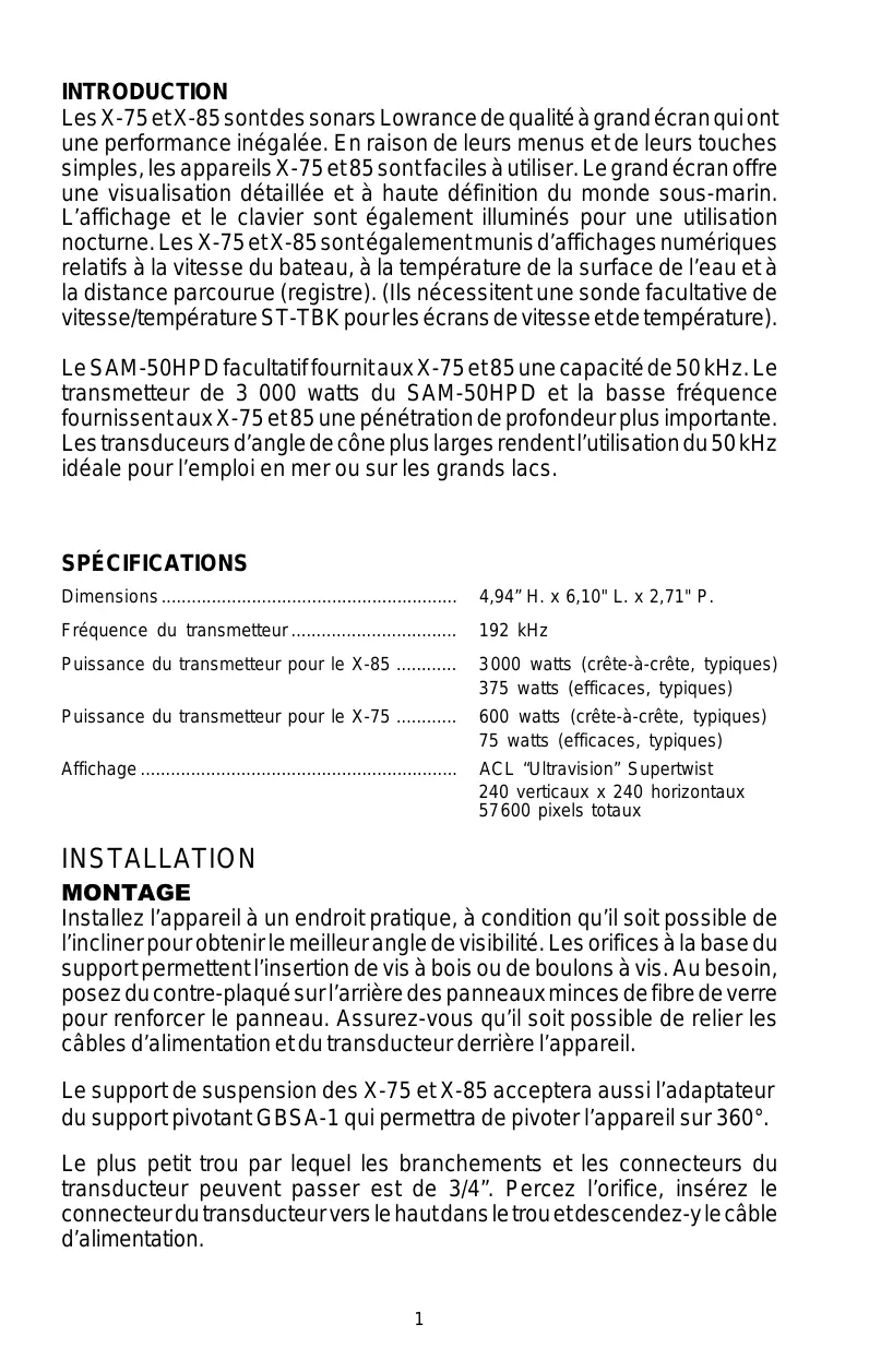 INTRODUCTION Les X-75 et X-85 sont des sonars Lowrance de qualité à grand écran qui ont une performance inégalée. En raison de leurs menus et de leurs touches simples, les appareils X-75 et 85 sont faciles à utiliser. Le grand écran offre une visualisation détaillée et à haute définition du monde sous-marin. L’affichage et le clavier sont également illuminés pour une utilisation nocturne. Les X-75 et X-85 sont également munis d’affichages numériques relatifs à la vitesse du bateau, à la température de la surface de l’eau et à la distance parcourue (registre). (Ils nécessitent une sonde facultative de vitesse/température ST-TBK pour les écrans de vitesse et de température). Le SAM-50HPD facultatif fournit aux X-75 et 85 une capacité de 50 kHz. Le transmetteur de 3 000 watts du SAM-50HPD et la basse fréquence fournissent aux X-75 et 85 une pénétration de profondeur plus importante. Les transduceurs d’angle de cône plus larges rendent l’utilisation du 50 kHz idéale pour l’emploi en mer ou sur les grands lacs. SPÉCIFICATIONS Dimensions ........................................................... 4,94” H. x 6,10" L. x 2,71" P. Fréquence du transmetteur ................................. 192 kHz Puissance du transmetteur pour le X-85 ............ 3 000 watts (crête-à-crête, typiques) 375 watts (efficaces, typiques) Puissance du transmetteur pour le X-75 ............ 600 watts (crête-à-crête, typiques) 75 watts (efficaces, typiques) Affichage ............................................................... ACL “Ultravision” Supertwist 240 verticaux x 240 horizontaux 57 600 pixels totaux INSTALLATION MONTAGE Installez l’appareil à un endroit pratique, à condition qu’il soit possible de l’incliner pour obtenir le meilleur angle de visibilité. Les orifices à la base du support permettent l’insertion de vis à bois ou de boulons à vis. Au besoin, posez du contre-plaqué sur l’arrière des panneaux minces de fibre de verre pour renforcer le panneau. Assurez-vous qu’il soit possible de relier les câbles d’alimentation et du transducteur derrière l’appareil. Le support de suspension des X-75 et X-85 acceptera aussi l’adaptateur du support pivotant GBSA-1 qui permettra de pivoter l’appareil sur 360°. Le plus petit trou par lequel les branchements et les connecteurs du transducteur peuvent passer est de 3/4”. Percez l’orifice, insérez le connecteur du transducteur vers le haut dans le trou et descendez-y le câble d’alimentation.