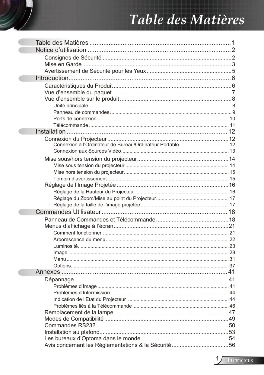 Menus d’affichage à l’écran21 Comment fonctionner 21 Arborescence du menu 22 Luminosité 23 Image 28 Menu 31 Remplacement de la lampe47 Modes de Compatibilité49 Commandes RS23250 Installation au plafond53 Les bureaux d’Optoma dans le monde54 Avis concernant les Réglementations & la Sécurité56