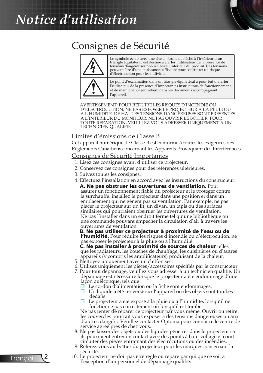 dépannage est nécessaire lorsque le projecteur a été endommagé d’une façon quelconque, tels que : Le cordon d’alimentation ou la fiche sont endommagés. Un liquide a été renversé sur l’appareil ou des objets sont tombés dedans. Le projecteur a été exposé à la pluie ou à l’humidité, lorsqu’il ne fonctionne pas correctement ou lorsqu’il est tombé. Ne pas tenter de réparer ce projecteur par vous même. Ouvrir ou retirer les couvercles pourrait vous exposer à des tensions dangereuses ou aux d’autres dangers. Veuillez contacter Optoma pour connaître le centre de service agréé près de chez vous.
