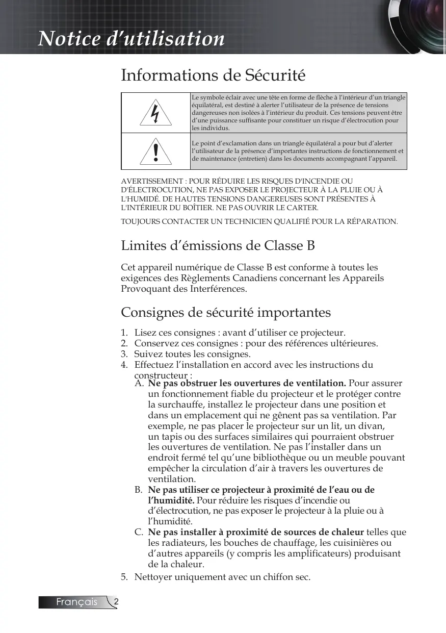 B. Ne pas utiliser ce projecteur à proximé de l'eau ou de l'humidité. Pour réduire les risques d'incendie ou d'électrocution, ne pas exposer le projecteur à la pluie ou à l'humidité.