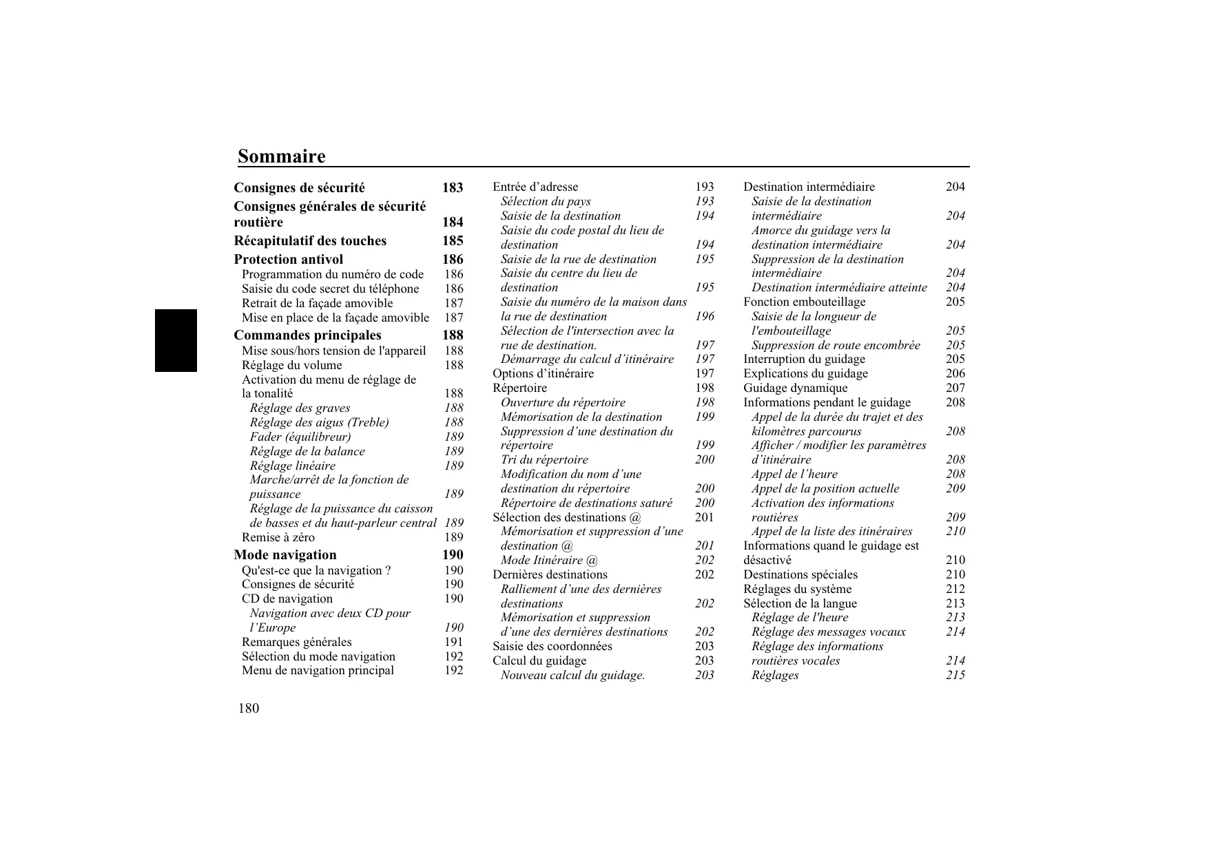 Destination intermédiaire Saisie de la destination intermédiaire Amorce du guidage vers la destination intermédiaire Suppression de la destination intermédiaire Destination intermédiaire atteinte Fonction embouteillage Saisie de la longueur de l'embouteillage Suppression de route encombrée Interruption du guidage Explications du guidage Guidage dynamique Informations pendant le guidage Appel de la durée du trajet et des kilomètres parcourus Afficher / modifier les paramètres d’itinéraire Appel de l’heure Appel de la position actuelle Activation des informations routières Appel de la liste des itinéraires Informations quand le guidage est désactivé Destinations spéciales Réglages du système Sélection de la langue Réglage de l'heure Réglage des messages vocaux Réglage des informations routières vocales Réglages