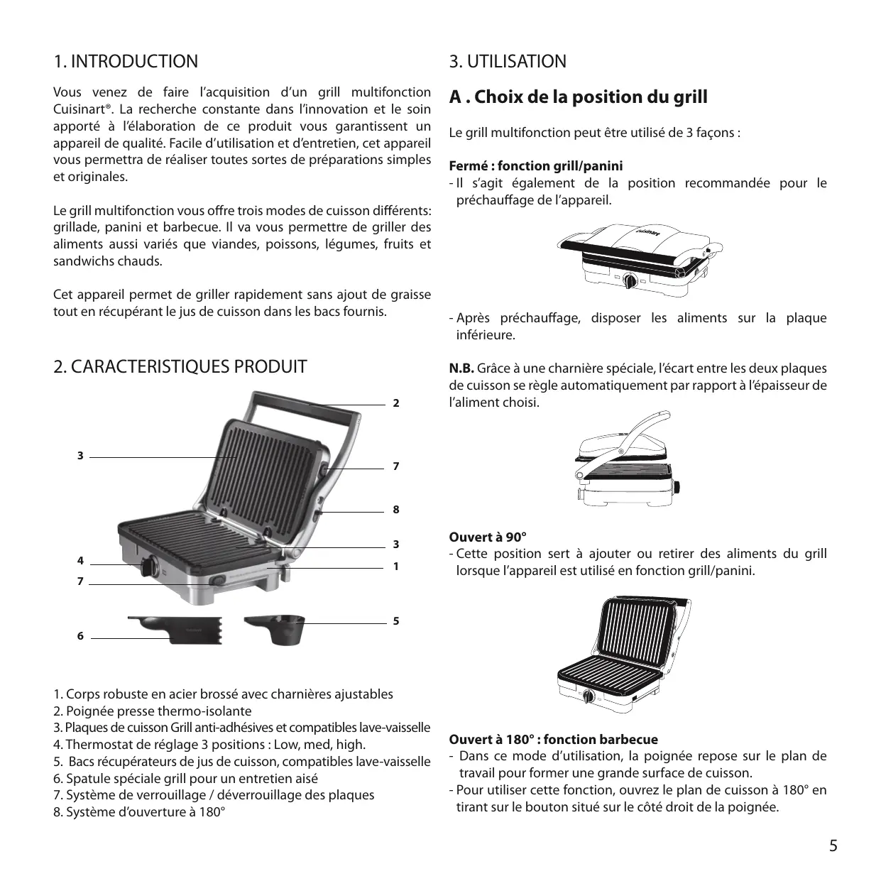 - 7. Istruzioni di sicurezza Vous venez de faire l’acquisition d’un grill multifonction Cuisinart®. La recherche constante dans l’innovation et le soin apporté à l’élaboration de ce produit vous garantissent un appareil de qualité. Facile d’utilisation et d’entretien, cet appareil vous permettra de réaliser toutes sortes de préparations simples et originales. A . Choix de la position du grill Le grill multifonction vous offre trois modes de cuisson différents: grillade, panini et barbecue. Il va vous permettre de griller des aliments aussi variés que viandes, poissons, légumes, fruits et sandwichs chauds. Cet appareil permet de griller rapidement sans ajout de graisse tout en récupérant le jus de cuisson dans les bacs fournis. Le grill multifonction peut être utilisé de 3 façons : Fermé : fonction grill/panini - Il s’agit également de la position recommandée pour le préchauffage de l’appareil. - Après préchauffage, disposer les aliments sur la plaque inférieure. N.B. Grâce à une charnière spéciale, l’écart entre les deux plaques de cuisson se règle automatiquement par rapport à l’épaisseur de l’aliment choisi. p. 46