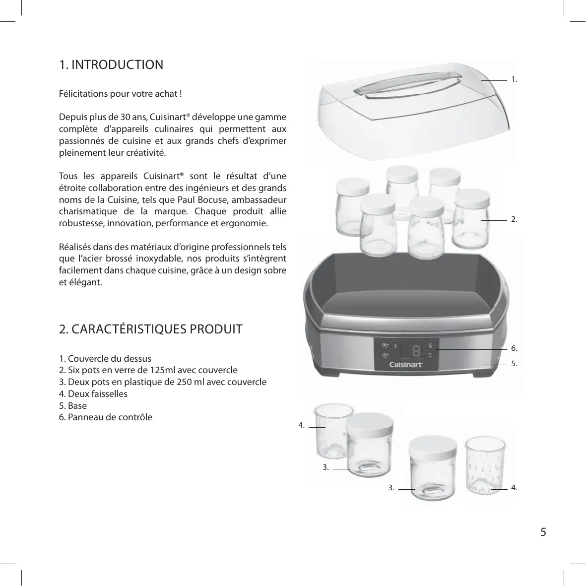 Conditions requises Le yaourt est issu de la fermentation du lait. Pour que cette transformation se produise, il faut que le lait soit porté à une température comprise entre 40 et 45°C et que des bactéries thermophiles soient ajoutées à ce lait. Les bactéries ont en effet besoin d’une tiédeur pour se développer. S’il fait trop chaud: elles meurent. Si, au contraire, il fait trop froid elles restent engourdies. La yaourtière Cuisinart® a été conçue pour s’assurer que les conditions optimales soient réunies. Son rôle est donc d’élever et de maintenir une température stable afin que les ferments puissent se développer. Suggestions pour le choix du lait La teneur du lait en matière grasse influe directement sur la saveur, la texture et la valeur nutritive du produit final. Aussi, les yaourts les plus fermes sont ceux obtenus avec du lait entier. Ceux-ci sont également plus savoureux, plus gras et plus énergétiques. Les laits demi-écrémés permettent d’obtenir, quant à eux, des yaourts plus liquides. Lait pasteurisé demi écrémé ou entier Il s’agit du lait le plus utilisé et donnant les meilleurs résultats. Lait stérilisé U.H.T. demi écrémé ou entier Il permet d’obtenir un yaourt relativement ferme et sans peau. Les laits crus Il est conseillé de les faire bouillir avant utilisation afin de tuer toutes éventuelles bactéries néfastes. Dans le cas d’une utilisation de lait de brebis ou de chèvre, le yaourt obtenu sera moins ferme. Lait de soja Assurez-vous d’utiliser du lait de soja U.H.T. qui contient l’un des ingrédients suivants: fructose, miel ou malt. Au moins un de ces ingrédients est absolument nécessaire pour la fermentation. Lait en poudre En ajoutant 4 à 5 cuillères à vos préparations, le yaourt obtenu sera plus ferme, plus riche en calcium et en protéines. Temps de préparation conseillés Lait entier : 8 à 9 heures Lait demi écrémé : 10 heures Lait de soja : 9 à 10 heures Lait cru préalablement bouilli : 8 heures Ces temps sont indiqués pour un lait à température ambiante. Plus le lait de départ est froid et plus le temps de préparation doit être augmenté. Les Ferments Vous pouvez utiliser plusieurs types de ferments : - Un yaourt nature du commerce (de préférence sans protéine de lait). - Un yaourt issu du dernier cycle de fabrication. Dans ce cas, veillez à ne pas répéter le processus que 6 à 8 fois consécutives. - Un ferment sec ou lyophilisé. Suivez alors les indications d’emploi du ferment. Conseils