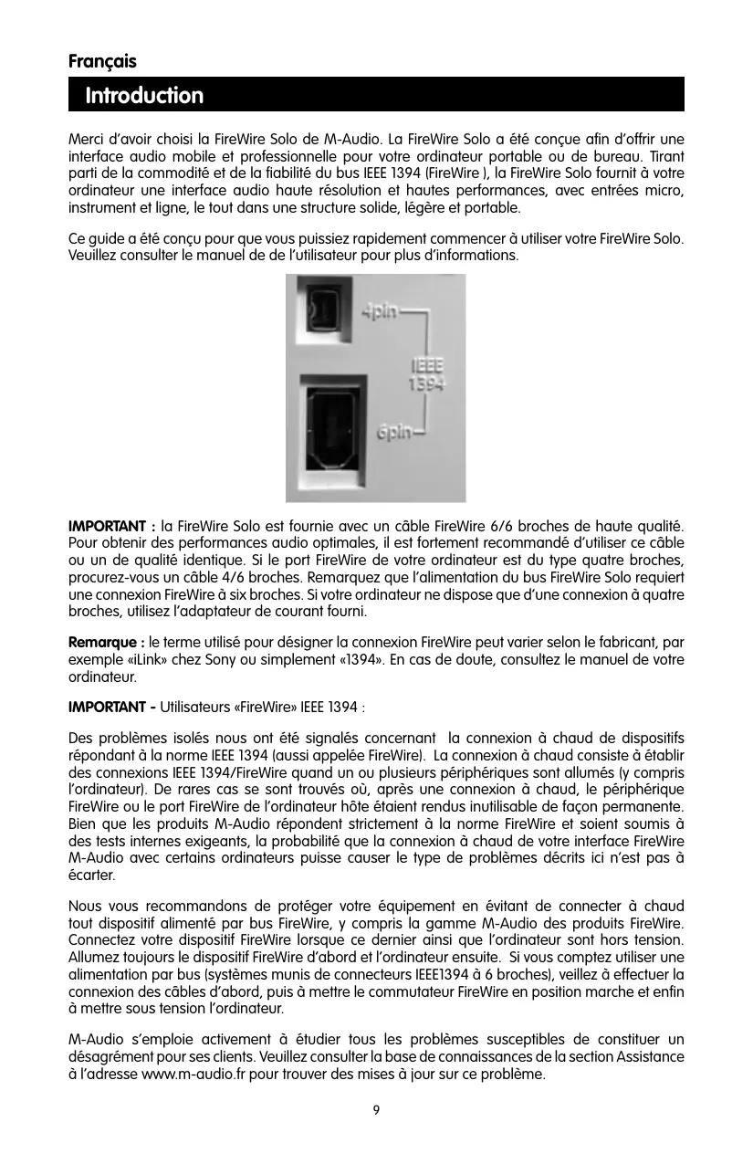 Introduction Merci d’avoir choisi la FireWire Solo de M-Audio. La FireWire Solo a été conçue afin d’offrir une interface audio mobile et professionnelle pour votre ordinateur portable ou de bureau. Tirant parti de la commodité et de la fiabilité du bus IEEE 1394 (FireWire), la FireWire Solo fournit à votre ordinateur une interface audio haute résolution et hautes performances, avec entrées micro, instrument et ligne, le tout dans une structure solide, légère et portable. Ce guide a été conçu pour que vous puissiez rapidement commencer à utiliser votre FireWire Solo. Veuillez consulter le manuel de de l’utilisateur pour plus d’informations. IMPORTANT : la FireWire Solo est fournie avec un câble FireWire 6/6 broches de haute qualité. Pour obtenir des performances audio optimales, il est fortement recommandé d’utiliser ce câble ou un de qualité identique. Si le port FireWire de votre ordinateur est du type quatre broches, procurez-vous un câble 4/6 broches. Remarquez que l’alimentation du bus FireWire Solo requiert une connexion FireWire à six broches. Si votre ordinateur ne dispose que d’une connexion à quatre broches, utilisez l’adaptateur de courant fourni. Remarque : le terme utilisé pour désigner la connexion FireWire peut varier selon le fabricant, par exemple «iLink» chez Sony ou simplement «1394». En cas de doute, consultez le manuel de votre ordinateur. IMPORTANT - Utilisateurs «FireWire» IEEE 1394 : Des problèmes isolés nous ont été signalés concernant la connexion à chaud de dispositifs répondant à la norme IEEE 1394 (aussi appelée FireWire). La connexion à chaud consiste à établir des connexions IEEE 1394/FireWire quand un ou plusieurs périphériques sont allumés (y compris l’ordinateur). De rares cas se sont trouvés où, après une connexion à chaud, le périphérique FireWire ou le port FireWire de l’ordinateur hôte étaient rendus inutilisable de façon permanente. Bien que les produits M-Audio répondent strictement à la norme FireWire et soient soumis à des tests internes exigeants, la probabilité que la connexion à chaud de votre interface FireWire M-Audio avec certains ordinateurs puisse causer le type de problèmes décrits ici n’est pas à écarter. Nous vous recommandons de protéger votre équipement en évitant de connecter à chaud tout dispositif alimenté par bus FireWire, y compris la gamme M-Audio des produits FireWire. Connectez votre dispositif FireWire lorsque ce dernier ainsi que l’ordinateur sont hors tension. Allumez toujours le dispositif FireWire d’abord et l’ordinateur ensuite. Si vous comptez utiliser une alimentation par bus (systèmes munis de connecteurs IEEE1394 à 6 broches), veillez à effectuer la connexion des câbles d’abord, puis à mettre le commutateur FireWire en position marche et enfin à mettre sous tension l’ordinateur. M-Audio s’emploie activement à étudier tous les problèmes susceptibles de constituer un désagrément pour ses clients. Veuillez consulter la base de connaissances de la section Assistance à l’adresse www.m-audio.fr pour trouver des mises à jour sur ce problème.
