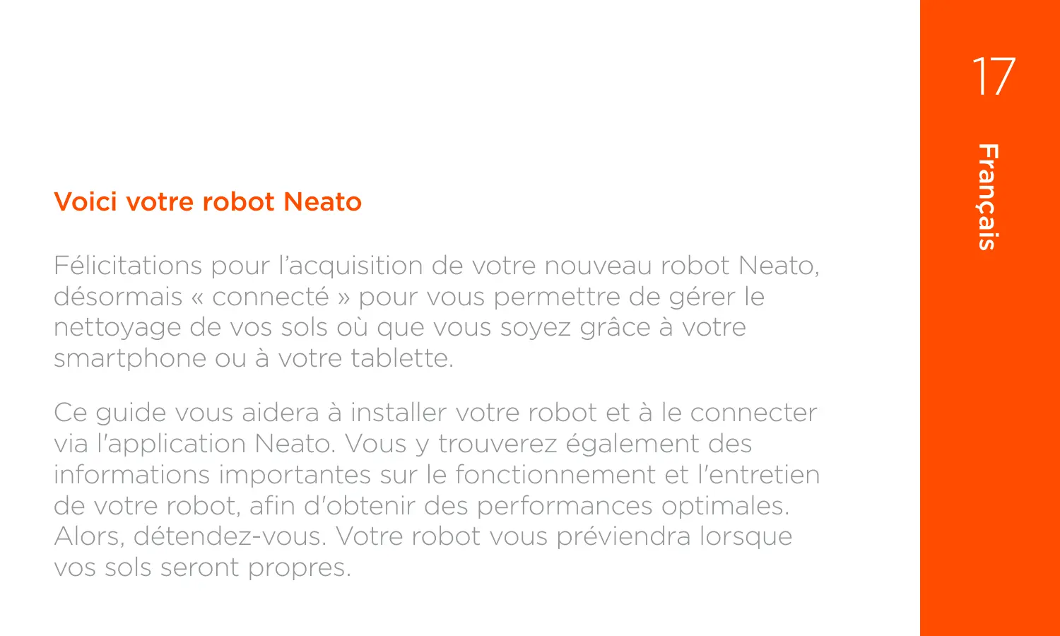 Félicitations pour l’acquisition de votre nouveau robot Neato, désormais « connecté » pour vous permettre de gérer le nettoyage de vos sols où que vous soyez grâce à votre smartphone ou à votre tablette. Ce guide vous aidera à installer votre robot et à le connecter via l'application Neato. Vous y trouverez également des informations importantes sur le fonctionnement et l'entretien de votre robot, afin d'obtenir des performances optimales. Alors, détendez-vous. Votre robot vous préviendra lorsque vos sols seront propres. Français Voici votre robot Neato Vue d'ensemble