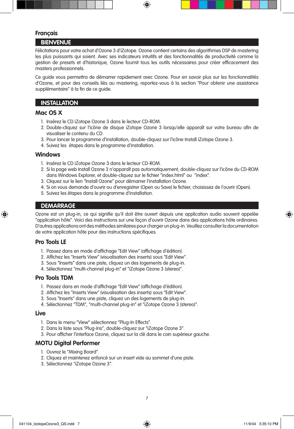 Français BIENVENUE Félicitations pour votre achat d’Ozone 3 d’iZotope. Ozone contient certains des algorithmes DSP de mastering les plus puissants qui soient. Avec ses indicateurs intuitifs et des fonctionnalités de productivité comme la gestion de presets et d’historique, Ozone fournit tous les outils nécessaires pour créer efficacement des masters professionnels. Ce guide vous permettra de démarrer rapidement avec Ozone. Pour en savoir plus sur les fonctionnalités d’Ozone, et pour des conseils liés au mastering, reportez-vous à la section “Pour obtenir une assistance supplémentaire” à la fin de ce guide. INSTALLATION Mac OS X