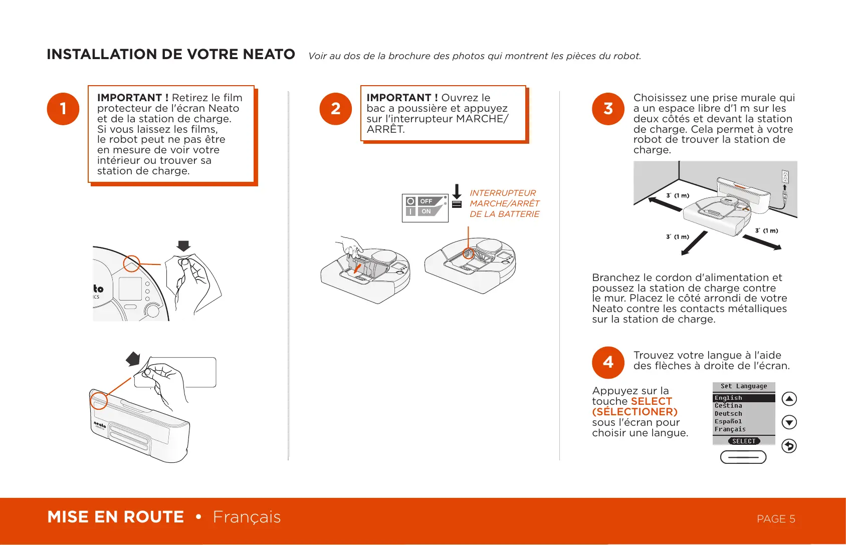 IMPORTANT ! Retirez le film protecteur de l'écran Neato et de la station de charge.