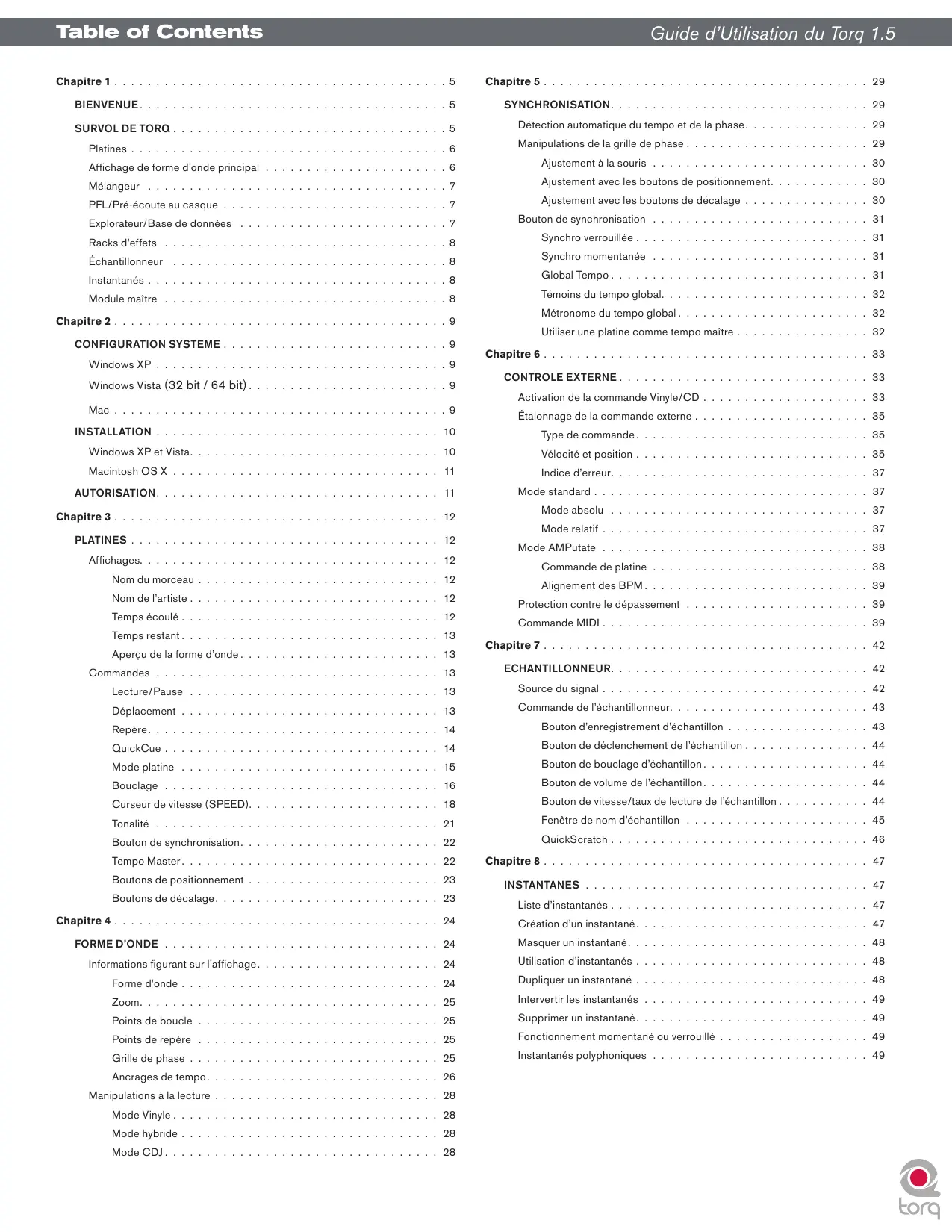 La solution habituelle est de retourner le disque sur l’autre face et une fois celle-ci abîmée aussi, jetez le disque et en obtenir un nouveau. Toutefois en utilisant l’option “Lead In” dans les préférences, vous pouvez augmenter la durée de vie de vos disques de contrôle. Par défaut le Lead In est réglé sur “0”, ce qui provoque la lecture de la musique à partir du début du disque. En passant le Lean In sur “1”, la musique attend une rotation supplémentaire avant de se lancer. Ainsi, quand le début d’un disque commence à être abîmé, augmentez le numéro de Lean In d’une valeur. Une fois que celle-ci est elle aussi brûlée, augmentez de nouveau le Lead In. Une fois que vous avez brûlé les deux faces du disque avec des Lead In jusqu’à 5, vous devrez acheter des vinyls de rechanges. Protection contre les sautes La protection contre les sautes est une option spéciale qui peut aider à éviter des erreurs embarrassantes ou des circonstances malheureuses quand vous utilisez des disques de contrôles Torq. Quand cette option est activée, Torq conserve la lecture de la musique même si l’aiguille glisse sur le disque que ce soit en raison du vent, d’un choc contre la cabine DJ, etc. Elle fonctionne comme le mode relatif (la position de l’aiguille est ignorée après la saute) sauf que la musique ne s’arrête pas dès que l’aiguille sort du disque. Si l’aiguille n’est plus en contact avec le disque, la musique continue pendant une demi-seconde. Si l’aiguille retouche le disque de nouveau dans ce délai, vous n’entendrez même pas la musique s’arrêter. Soyez conscient des limites de cette option : si le lecteur est bousculé au point de faire sauter totalement le bras de lecture, la musique s’arrête. ✓ Remarque : La protection contre les sautes peut être activée ou désactivée dans la barre d’outils de Torq.. Cliquez simplement sur le bouton de Protection contre les sautes pour se faire . Étalonnage de commande Les réglages dans cette préférence sont utilisés pour configurer chaque paire d’entrée de Torq pour une utilisation avec des disques ou CD de commande externe. Pour la commande vinyle, vous pouvez utiliser les disques de commande vinyle de Torq ou certaines version des disques de commande Ms. Pinky. » Type de commande (Gen1, Gen2, Gen3, Torq Vinyl, Torq CD) : ce menu vous permet de définir la source vinyle ou CD à utiliser pour la platine. Pour utiliser le vinyle de commande Torq ou le CD de commande Torq, sélectionnez, respectivement, “Torq Vinyl” ou “Torq CD”. Gen1, Gen2 et Gen3 correspondent aux générations 1, 2 et 3 des disques Ms Pinky. » Seuil de puissance : ce réglage définit le signal minimum nécessaire pour faire fonctionner la commande externe. Si ce réglage est trop faible, de petits bruits captés par le tourne-disque peuvent être faussement interprétés comme des signaux de commande. Si ce réglage est trop élevé, la platine ne répondra pas aux signaux de commande externe à des vitesses basses. Cela doit être réglé aussi bas que possible sans introduire d’anomalies. Reportez-vous à la section “Étalonnage de la commande externe” plus haut dans ce manuel pour connaître la procédure correcte d’étalonnage. » Vélocité : cet affichage vous permet de voir l’influence de l’entrée de commande externe. Normalement, la lecture du vinyle ou du CD de commande à sa vitesse originale doit produire un nombre très proche de 1 dans ce champ. » Position : quand la commande externe fonctionne normalement, cet affichage montre un nombre qui augmente tandis que la source est lue vers l’avant. » Indice d’erreur : si le nombre affiché dans ce champ est inférieur à 1,5, la source de commande est lue correctement. Si le nombre est supérieur à 2,0, l’affichage passe au rouge, ce qui indique des problèmes avec le signal de commande entrant. Vous devrez ensuite ajuster vos paramètres de commande, nettoyer vos disques et/ou remplacer votre aiguille pour régler ce problème.
