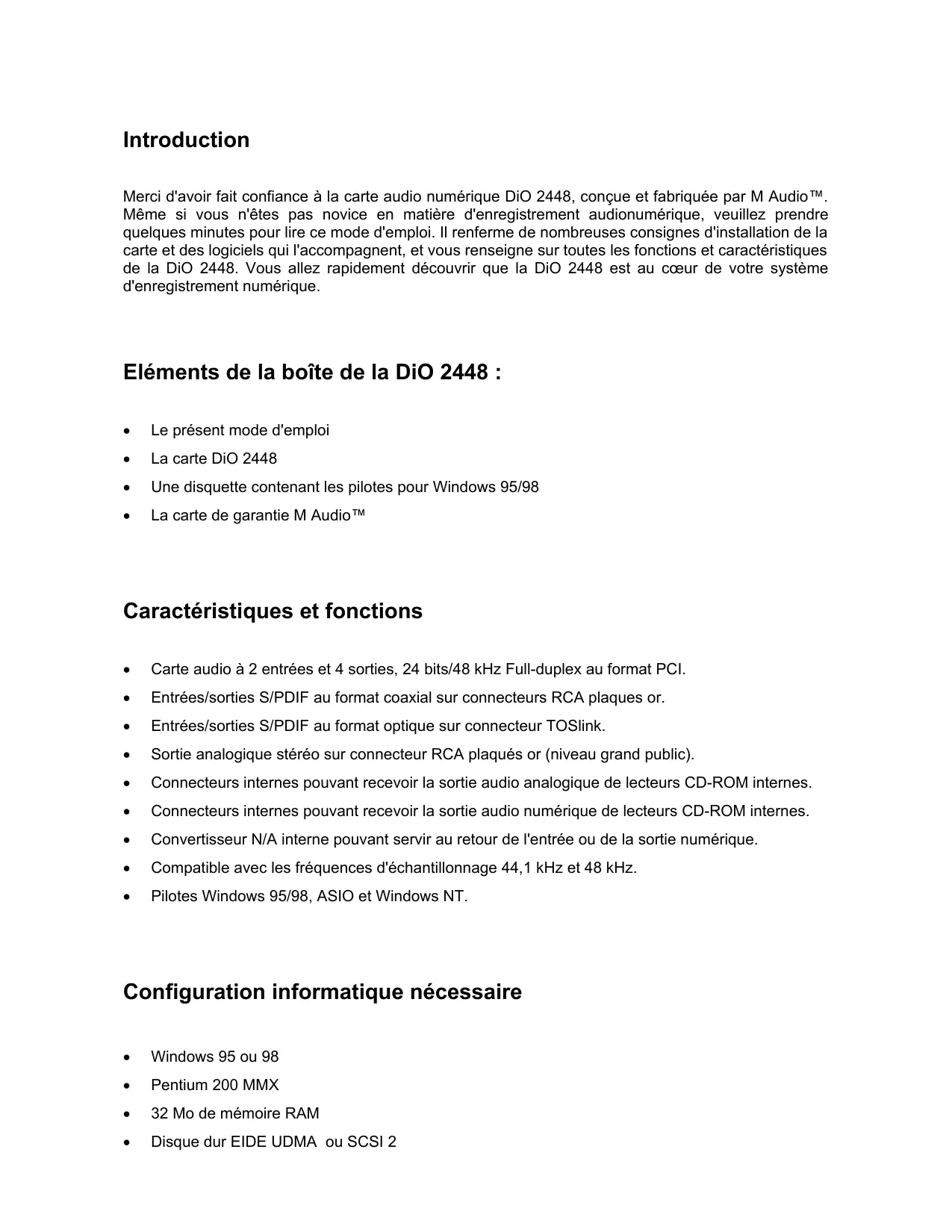 - Garantie à vie Distribution exclusive des produits MIDIMAN / M-AUDIO…………………………………21 Introduction Merci d'avoir fait confiance à la carte audio numérique DiO 2448, conçue et fabriquée par M Audio™. Même si vous n'êtes pas novice en matière d'enregistrement audionumérique, veuillez prendre quelques minutes pour lire ce mode d'emploi. Il renferme de nombreuses consignes d'installation de la carte et des logiciels qui l'accompagnent, et vous renseigne sur toutes les fonctions et caractéristiques de la DiO 2448. Vous allez rapidement découvrir que la DiO 2448 est au cœur de votre système d'enregistrement numérique. Eléments de la boîte de la DiO 2448 : p. 20