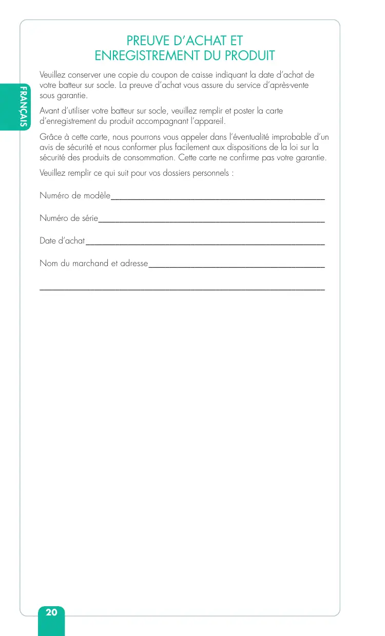 Avant d’utiliser votre batteur sur socle, veuillez remplir et poster la carte d’enregistrement du produit accompagnant l’appareil. Grâce à cette carte, nous pourrons vous appeler dans l’éventualité improbable d’un avis de sécurité et nous conformer plus facilement aux dispositions de la loi sur la sécurité des produits de consommation. Cette carte ne confirme pas votre garantie. Veuillez remplir ce qui suit pour vos dossiers personnels : Numéro de modèle ___________________________________________________ Numéro de série______________________________________________________ Date d’achat _________________________________________________________ Nom du marchand et adresse __________________________________________ ____________________________________________________________________