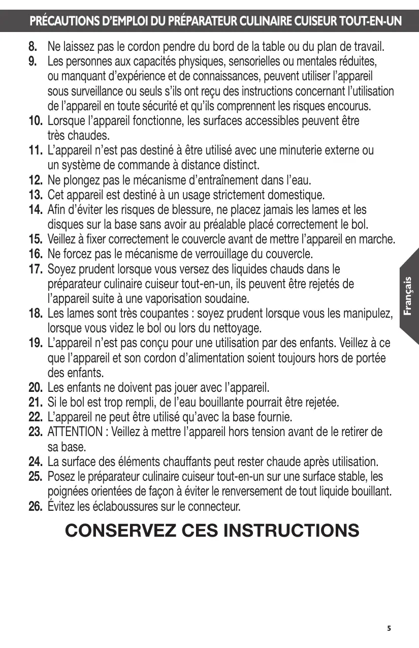 vêtements ainsi que les spatules et autres ustensiles à l’écart de l’appareil lorsqu’il fonctionne afin de réduire le risque de blessures et/ou de détériorations de l’appareil.