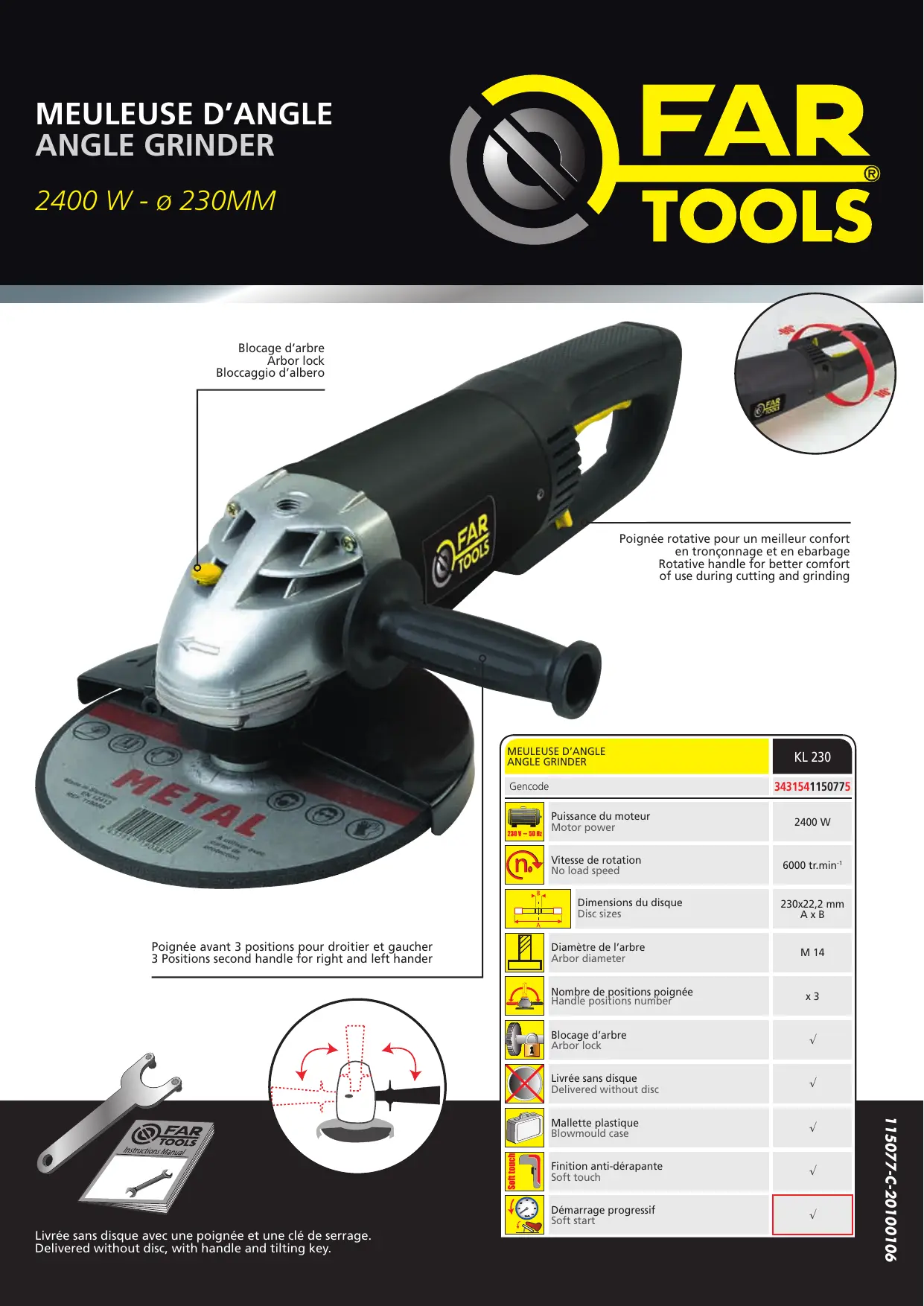 115077-C-20100106 Livrée sans disque avec une poignée et une clé de serrage. Delivered without disc, with handle and tilting key. 2400 W 113391-Fiche-B-20090126 Gencode