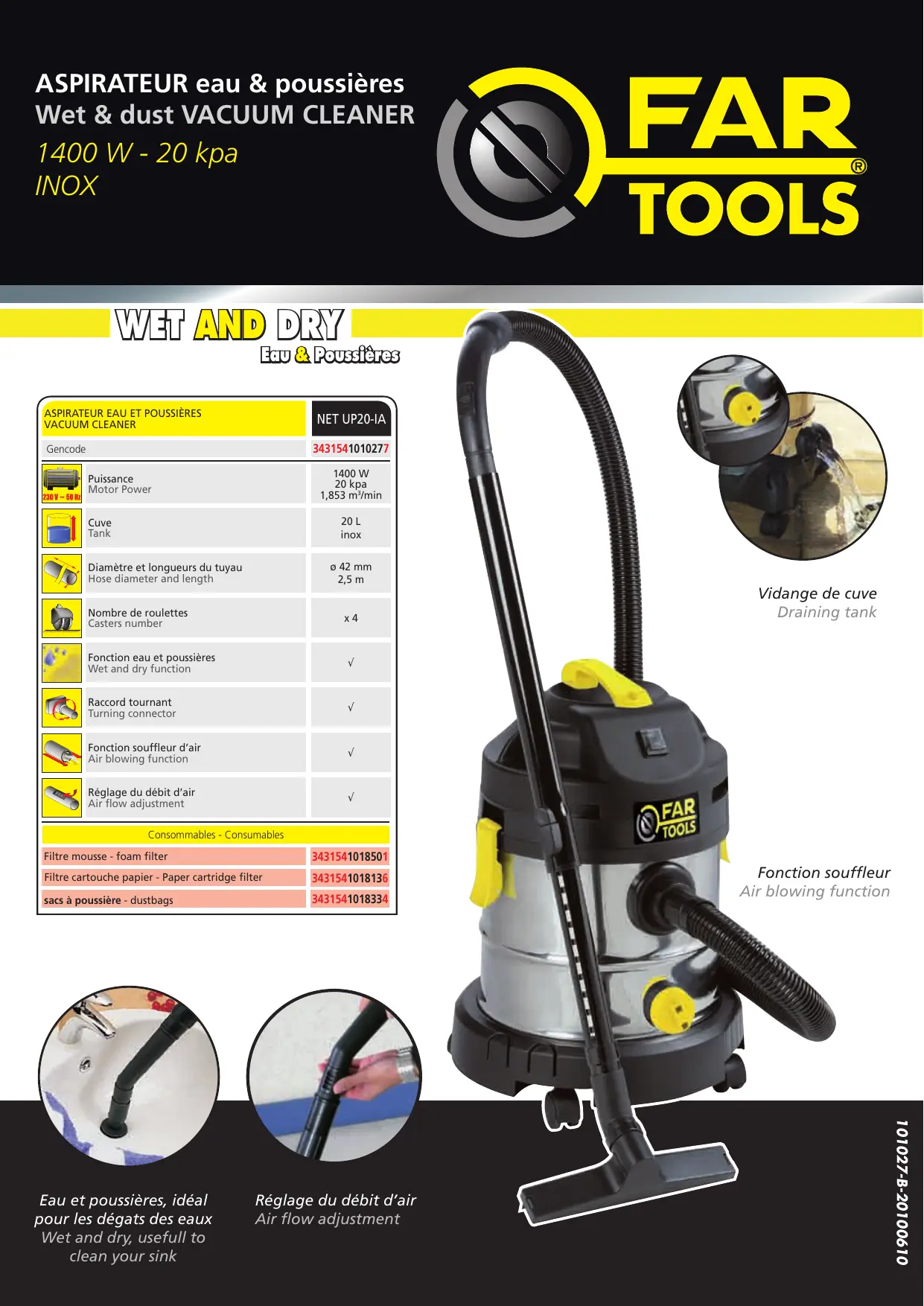 Réglage du débit d’air Air flow adjustment 101027-B-20100610 Eau et poussières, idéal pour les dégats des eaux Wet and dry, usefull to clean your sink Fonction souffleur Air blowing function